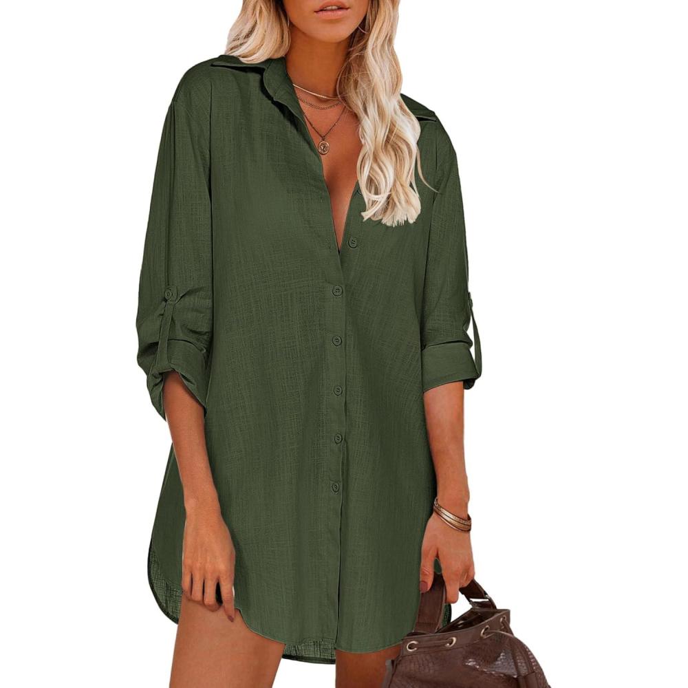HOTOUCH Women Boyfriend Shirts Button Down Long Sleeve Blouse Cuffed Sleeve Collared Shirt(Deep Green)