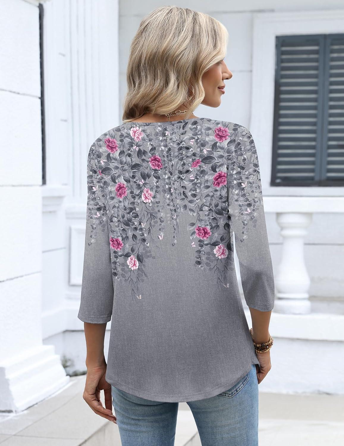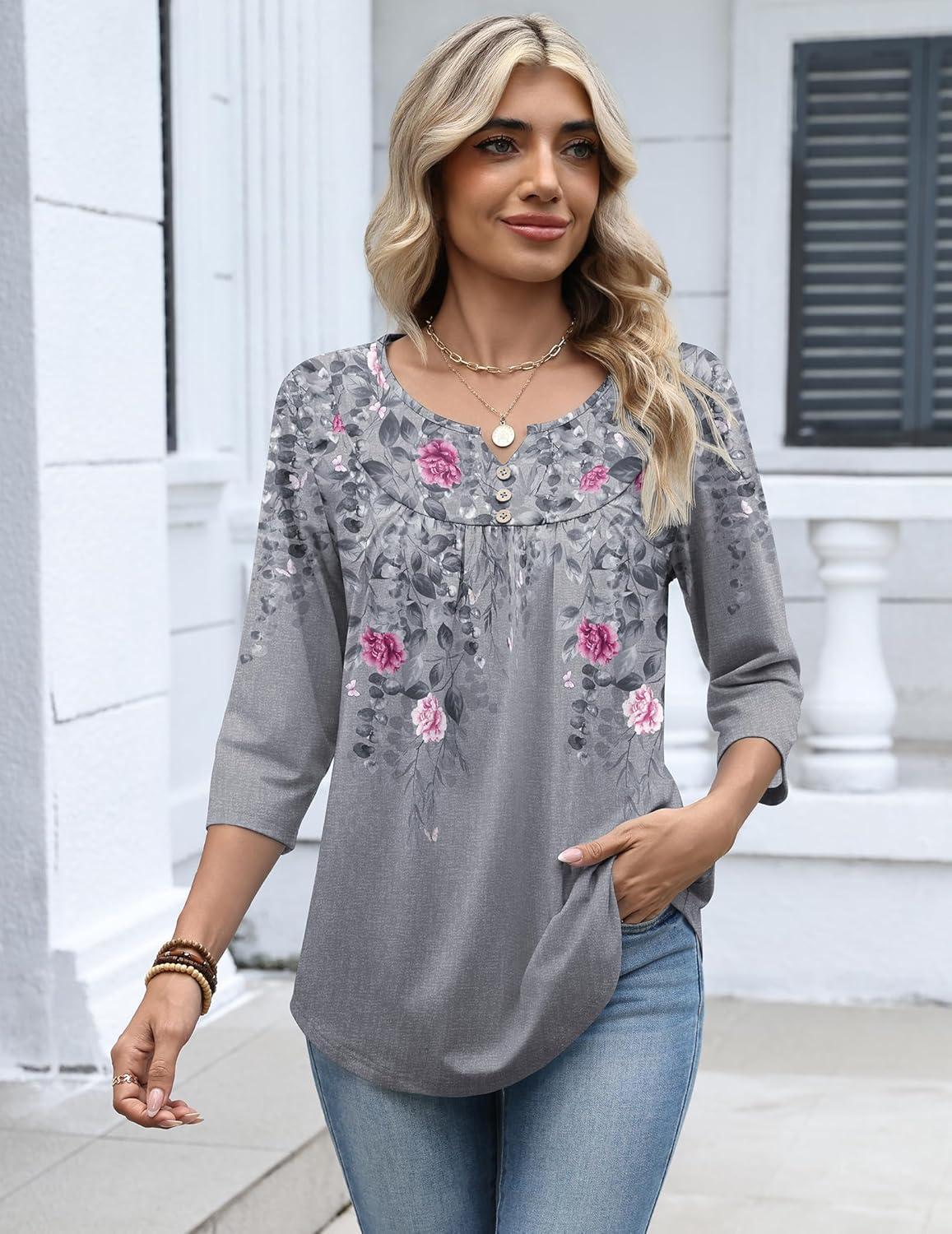 Womens Tops 3/4 Length Sleeve Womens Tops Henley V Neck Button Down Work Tunic Stretch Dressy Casual Shirts Loose Fit Ladies Tops and Blouses Basic Tee Long Sleeve Shirts for Women Boho Tops for Women Summer Spring Tops for Women Boho Chic Clothing Womens Fall Fashion 2025 Women Clothes