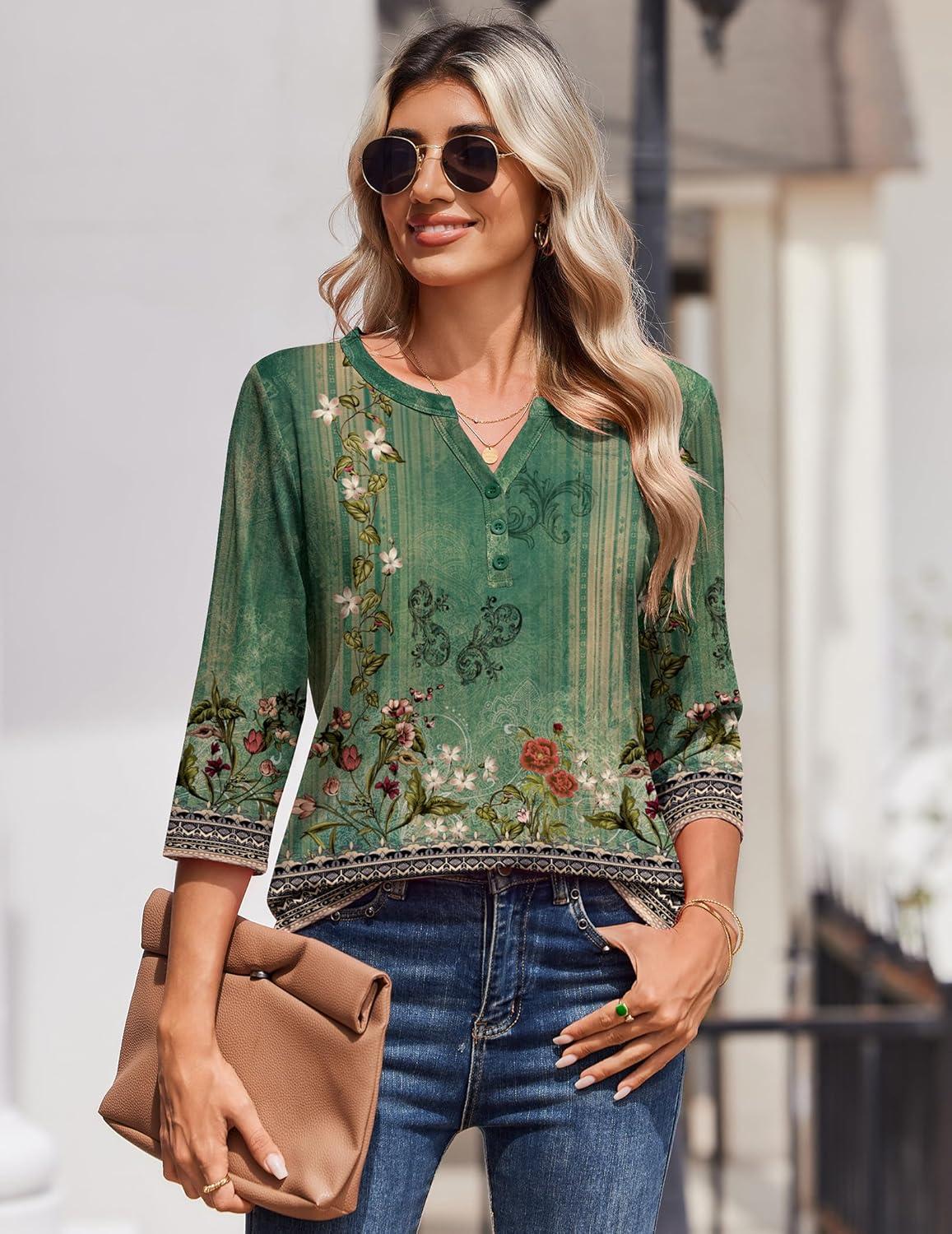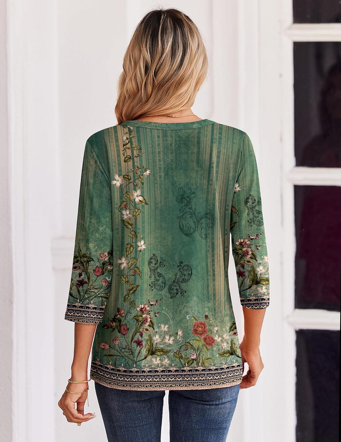 Zeagoo 3/4 Length Sleeve Womens Tops Casual Dressy Summer Blouses Buisness Work Spring Tee Shirts(Green Floral)