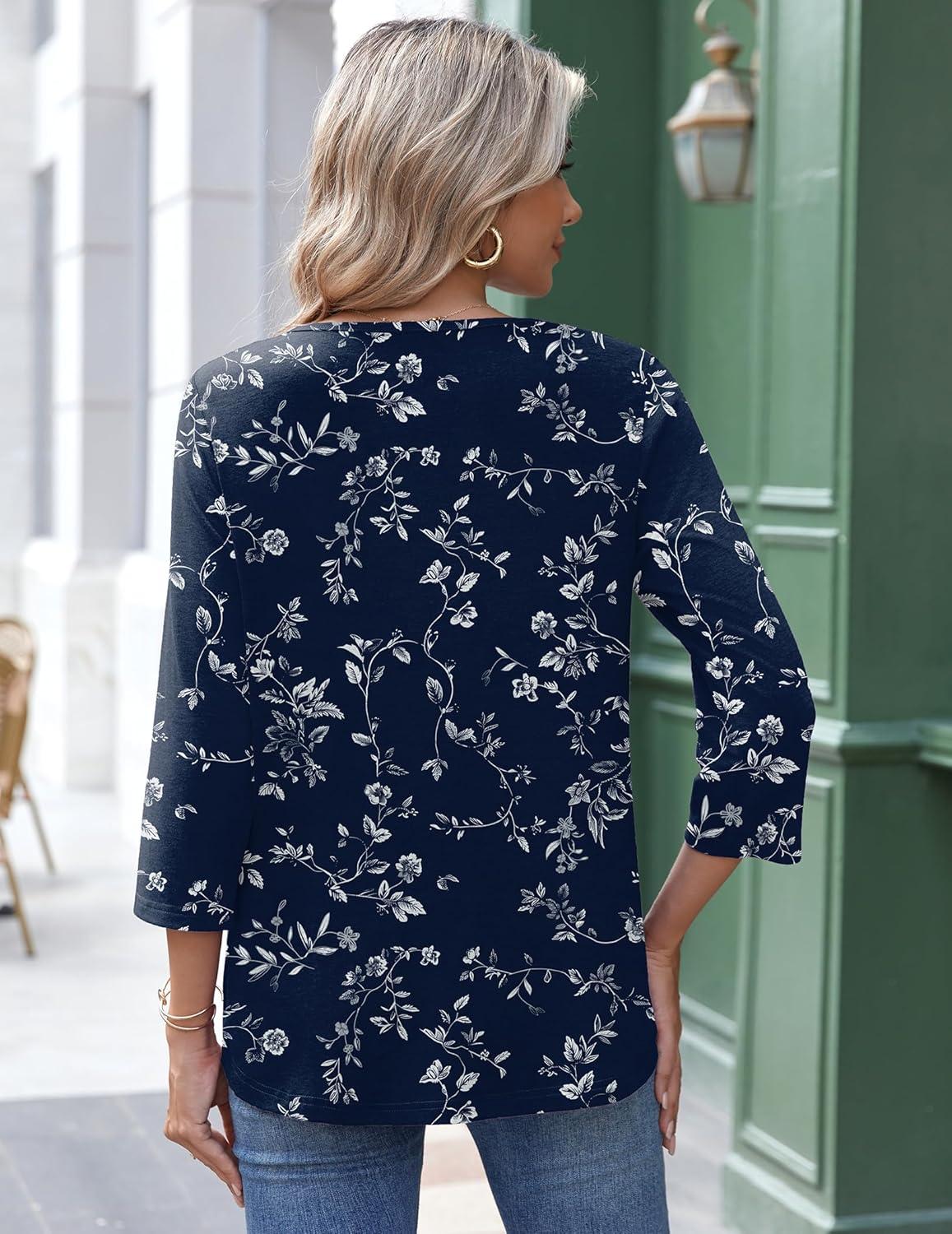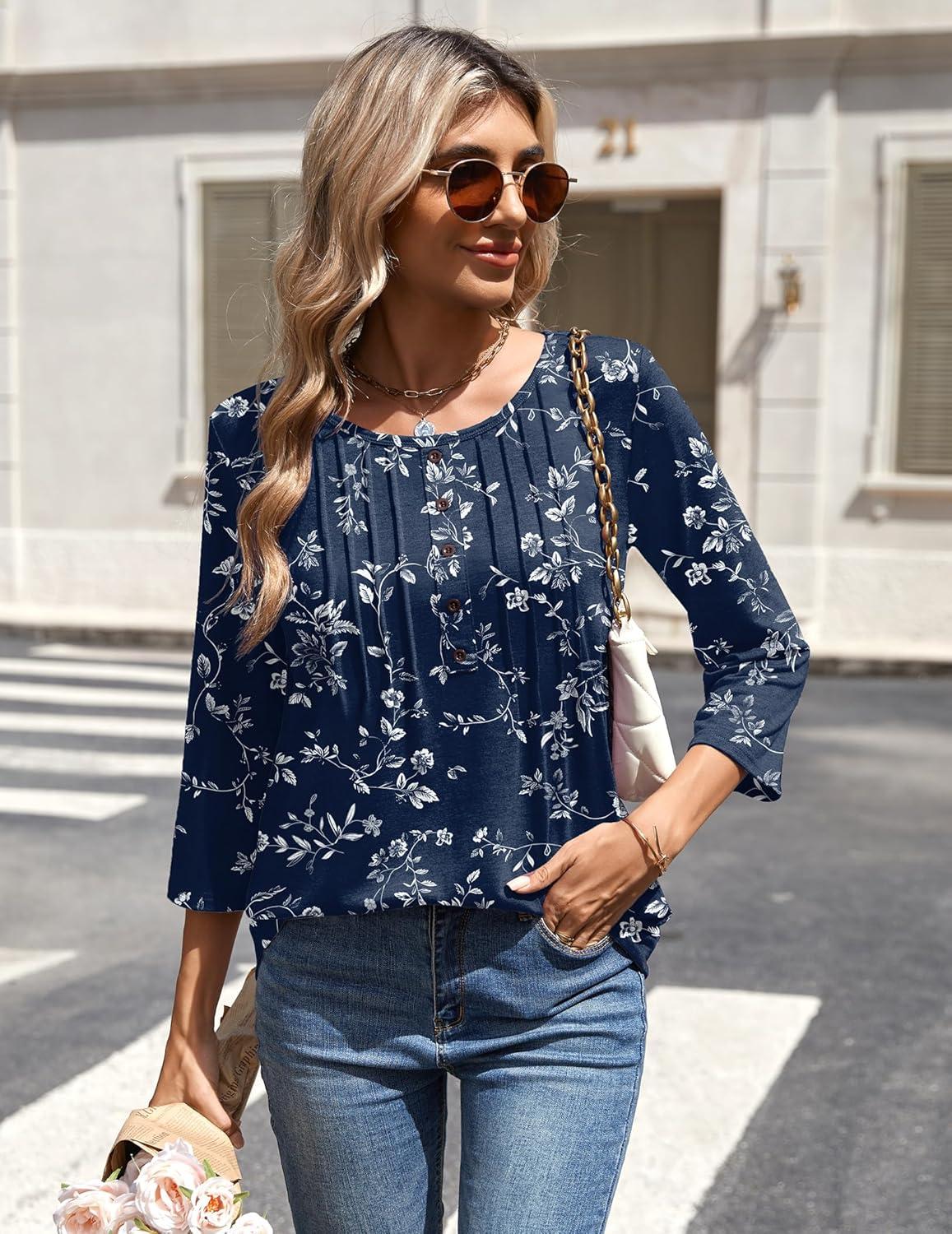 Zeagoo 3/4 Length Sleeve Womens Tops Round Neck Casual Summer Tunic Tops Basic Tees Blouses Dressy T-Shirts Pleated Shirts(02 Navy Floral)