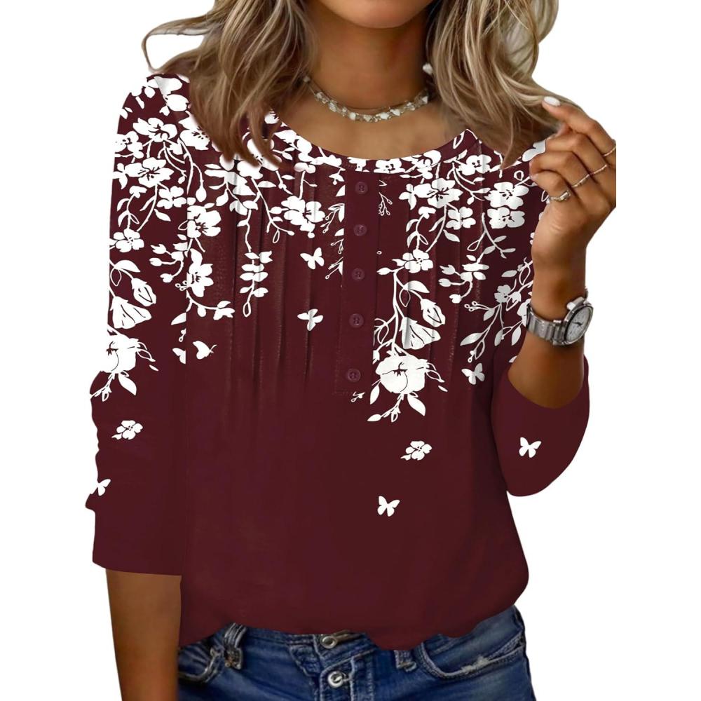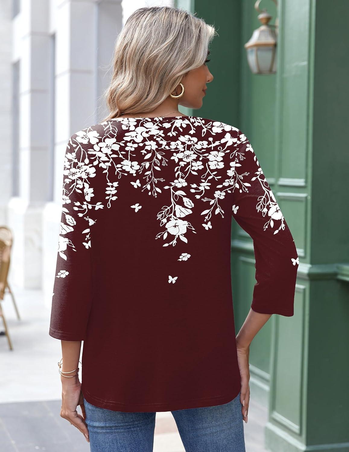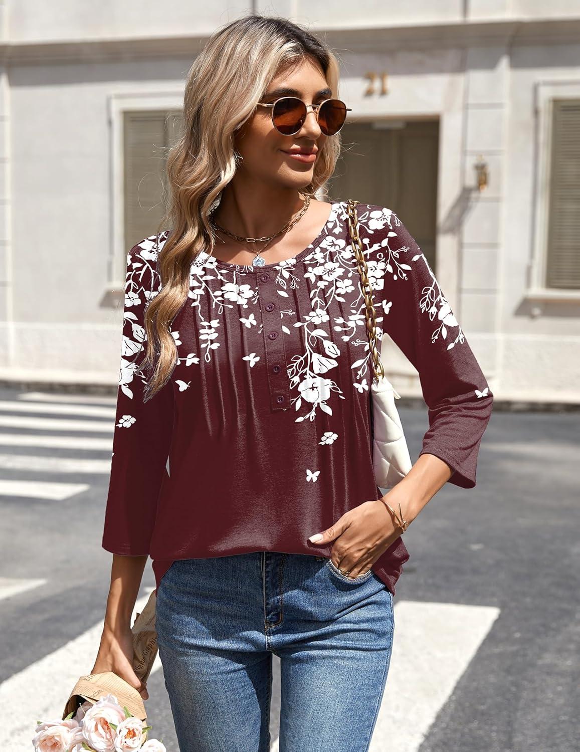 Zeagoo 3/4 Length Sleeve Womens Tops Round Neck Casual Summer Tunic Tops Basic Tees Blouses Dressy T-Shirts Pleated Shirts(02 Navy Floral)