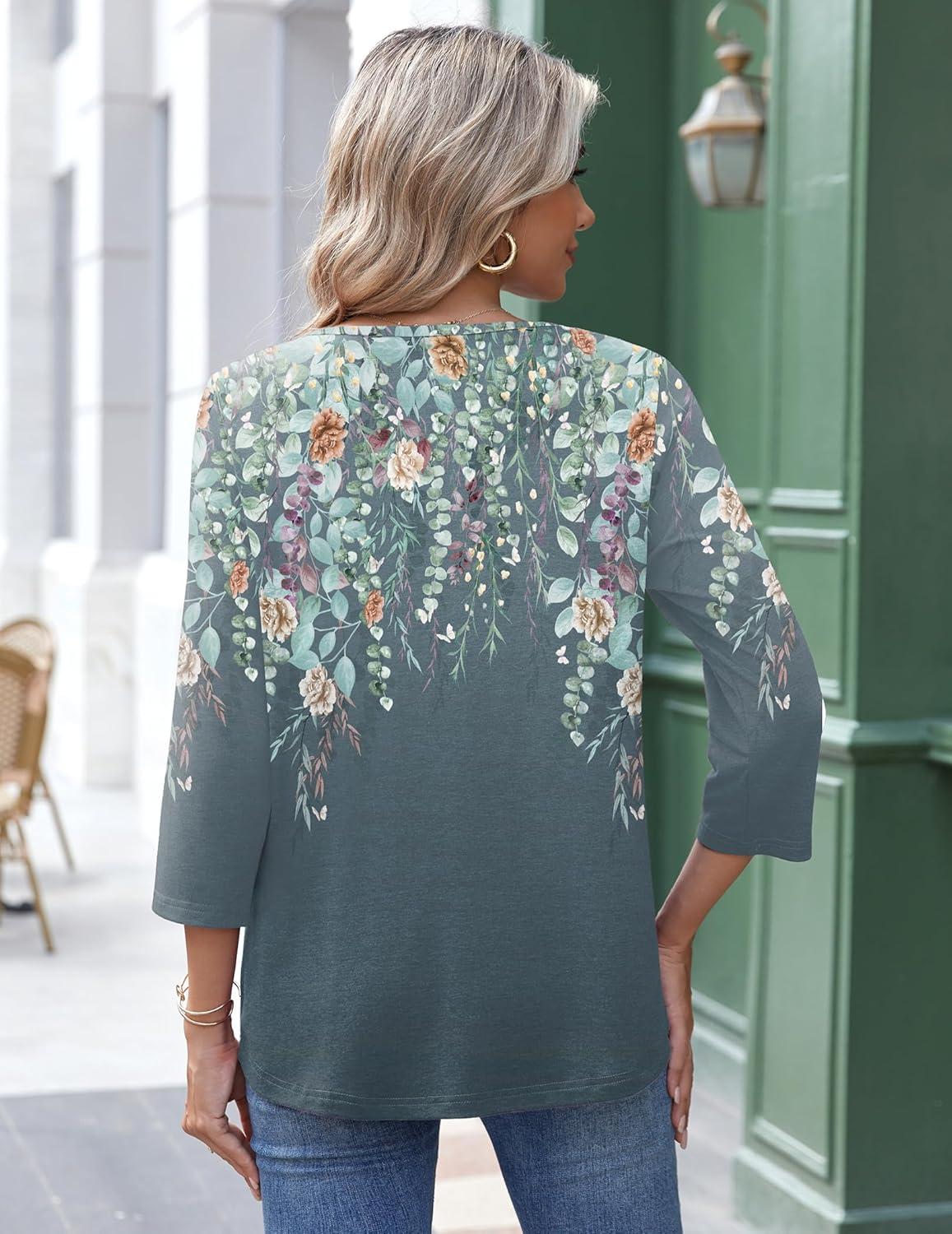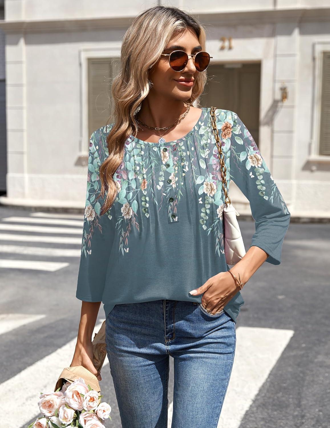 Zeagoo 3/4 Length Sleeve Womens Tops Round Neck Casual Summer Tunic Tops Basic Tees Blouses Dressy T-Shirts Pleated Shirts(Grey Floral)