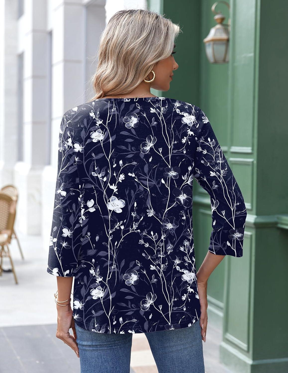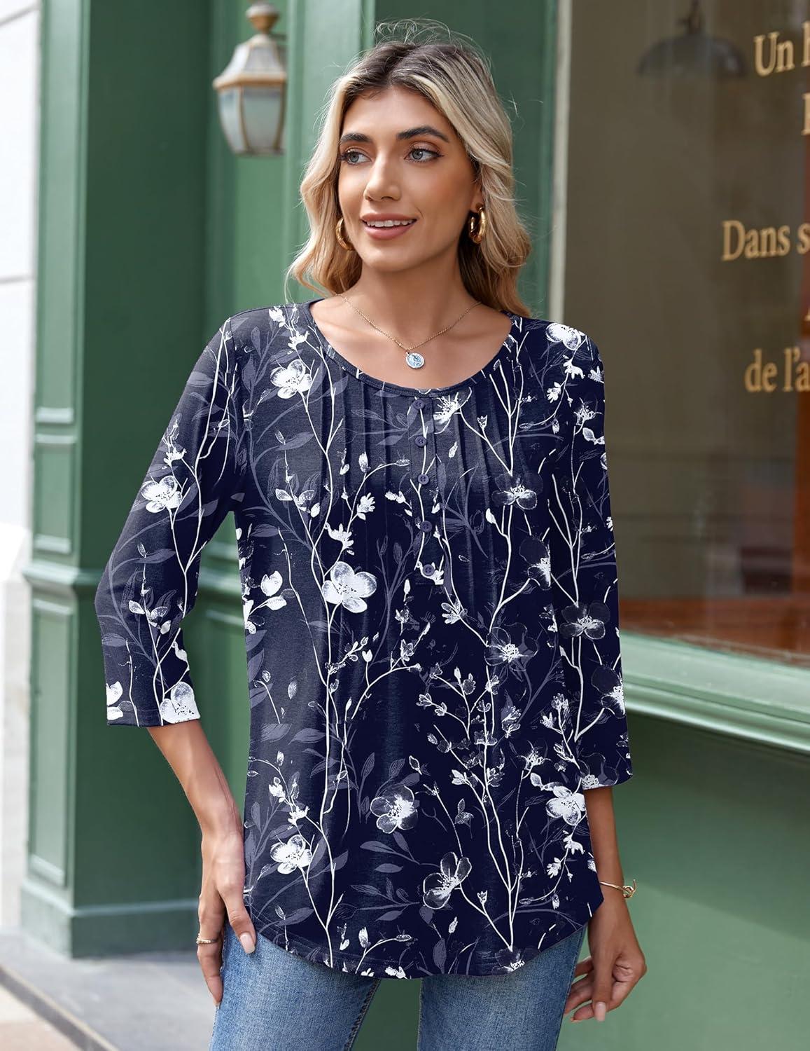 Zeagoo 3/4 Length Sleeve Womens Tops Round Neck Casual Summer Tunic Tops Basic Tees Blouses Dressy T-Shirts Pleated Shirts(Navy Floral)