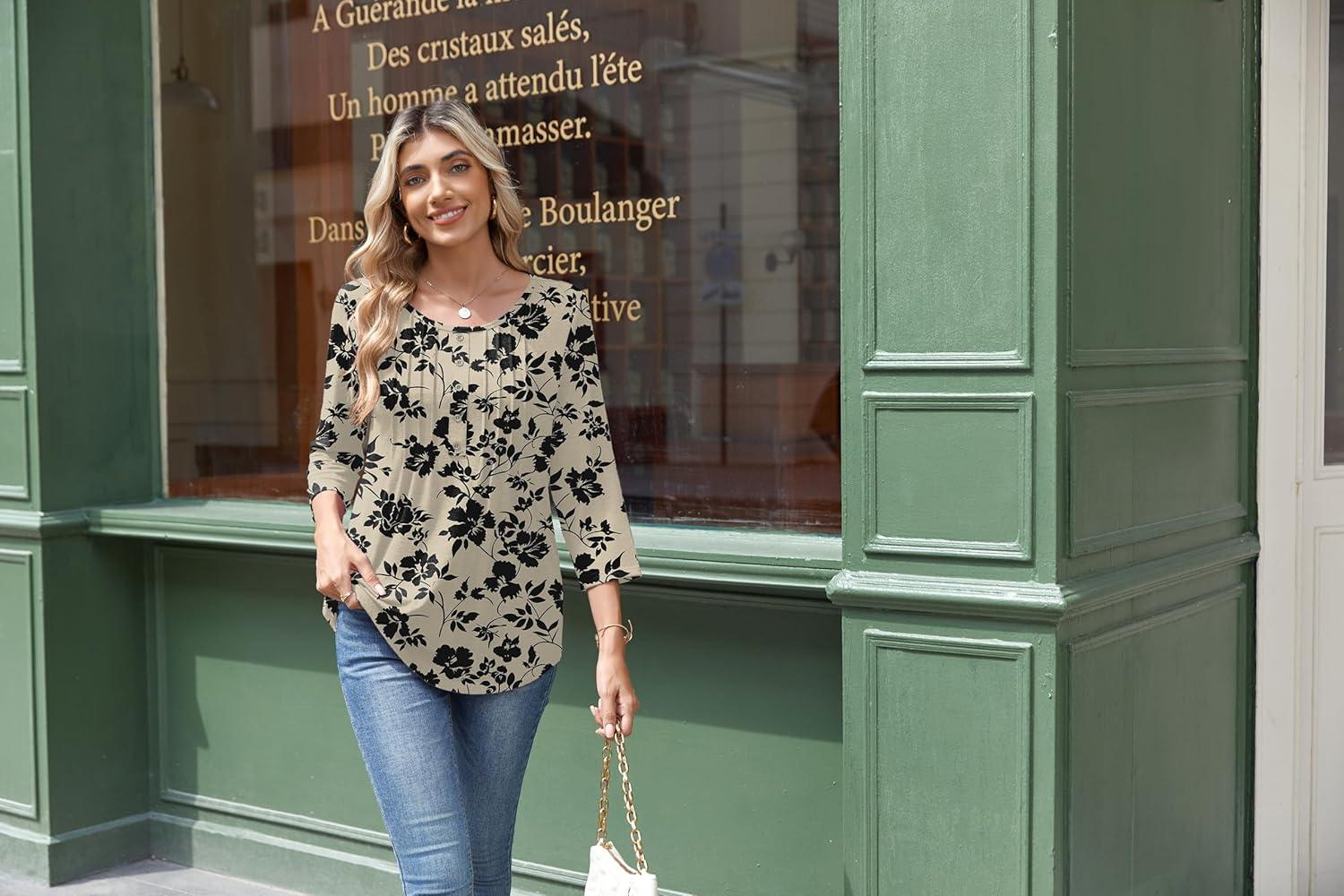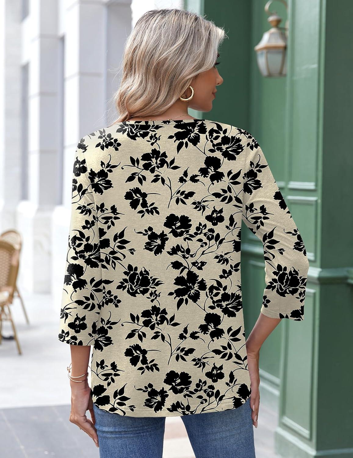 Zeagoo 3/4 Length Sleeve Womens Tops Round Neck Casual Summer Tunic Tops Basic Tees Blouses Dressy T-Shirts Pleated Shirts(Navy Floral)