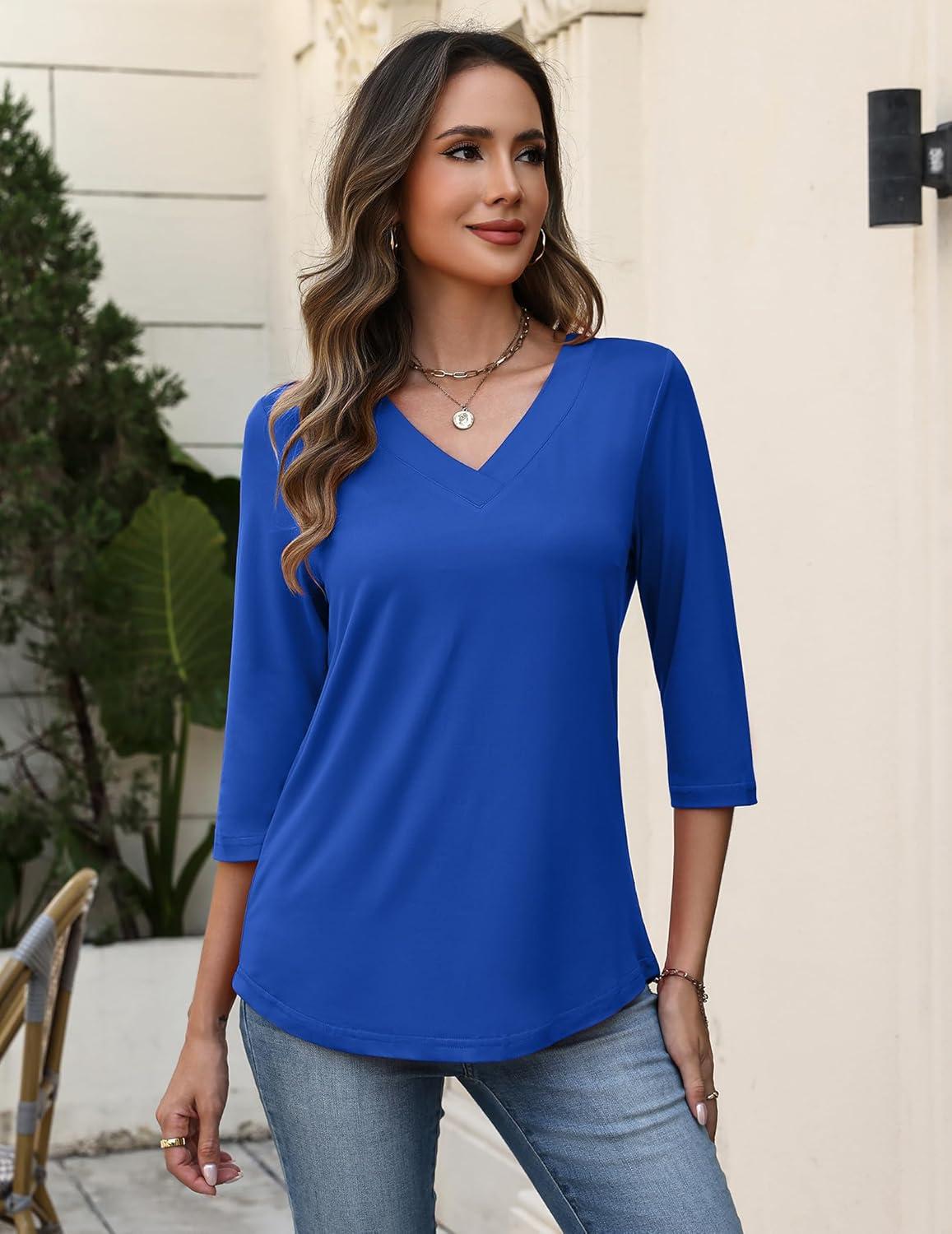 Zeagoo 3/4 Length Sleeve Womens Tops V Neck Shirt Dressy Casual Blouse Basic Tshirts 2025 Fashion Clothing S-2XL(Blue)