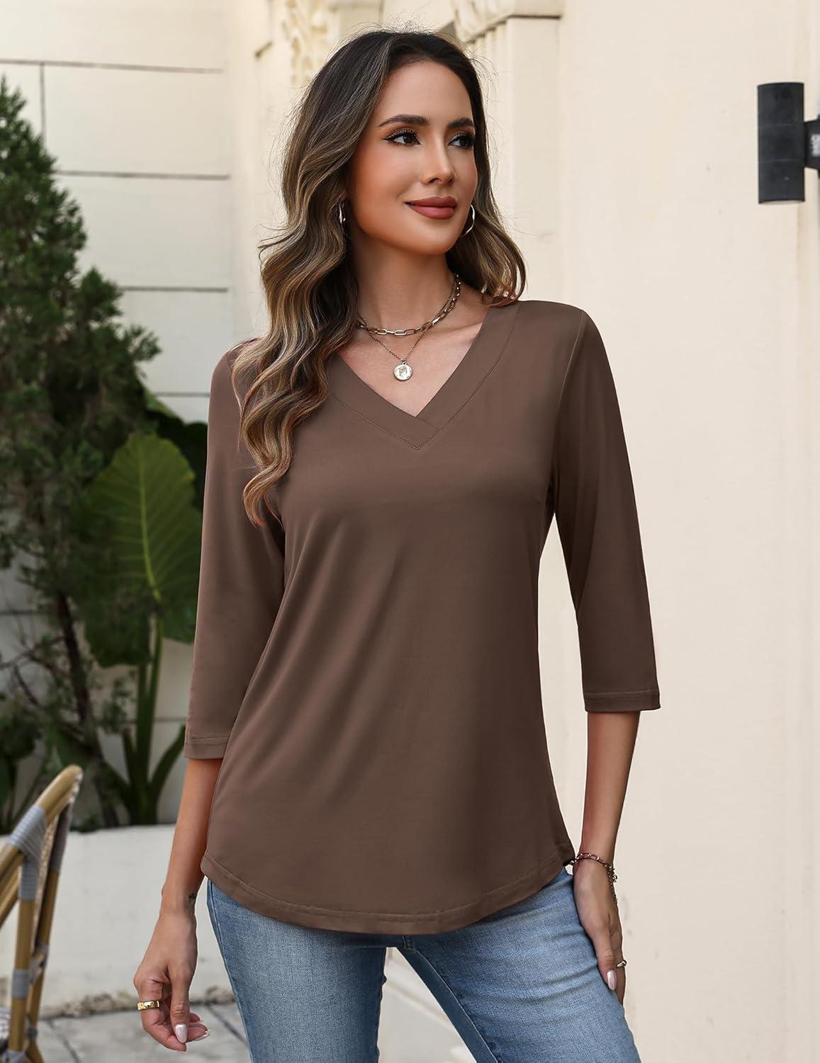 Zeagoo 3/4 Length Sleeve Womens Tops V Neck Shirt Dressy Casual Blouse Basic Tshirts 2025 Fashion Clothing S-2XL(Brown)