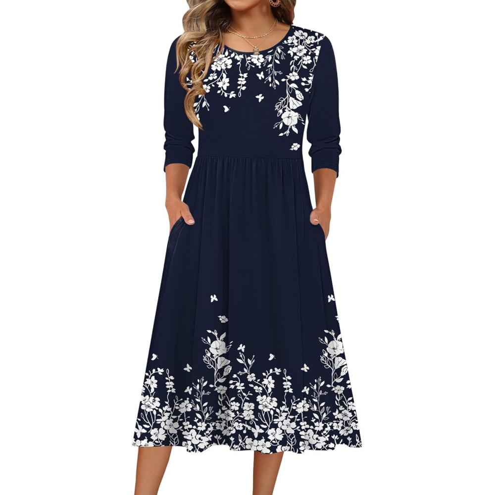 Zeagoo 3/4 Sleeve Women’s Dress Casual Flowy A-Line Midi Tshirt Dresses with Pockets Crewneck Vocation Boho Beach Sundress(Navy Blue Floral)