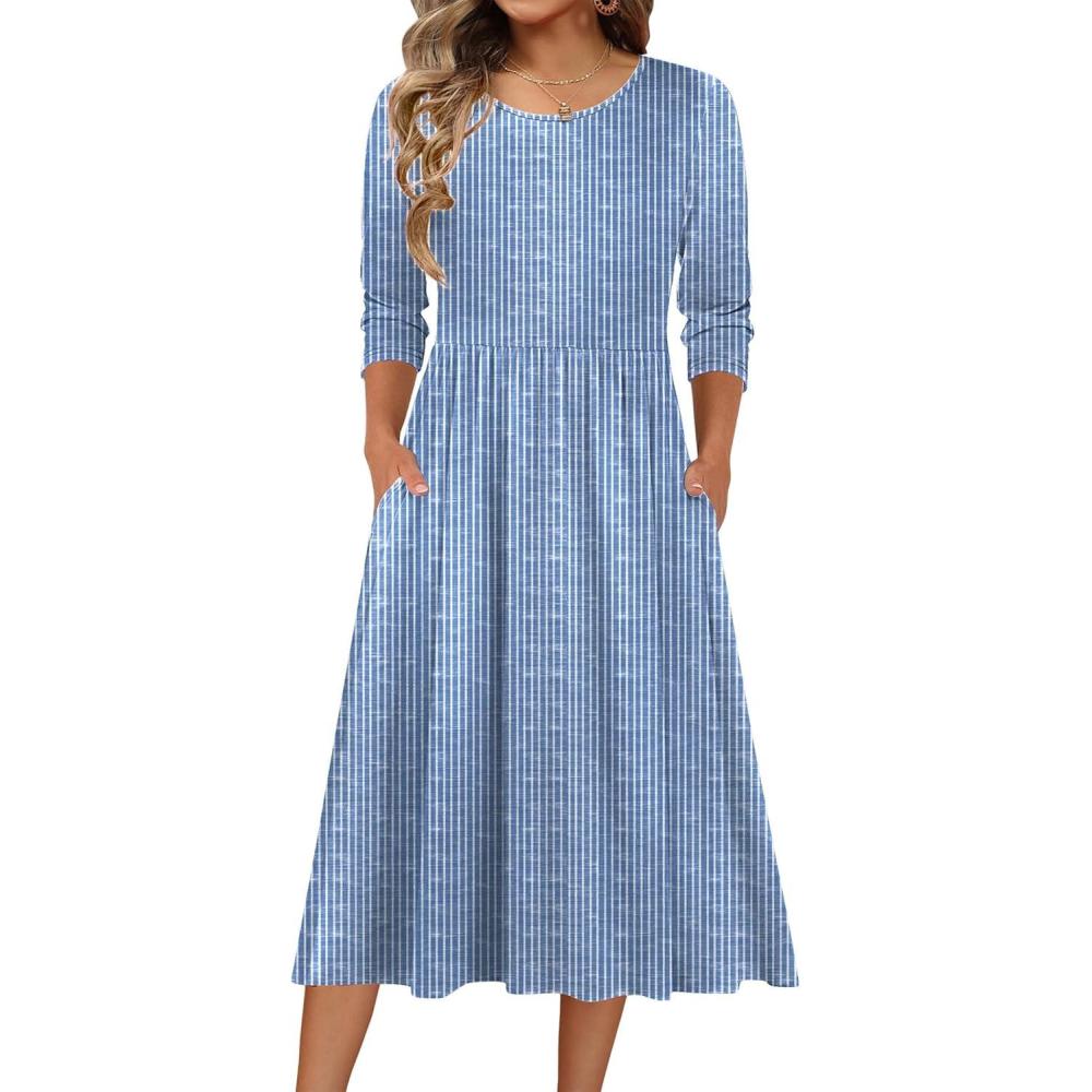 Zeagoo 3/4 Sleeve Women’s Dress Casual Flowy A-Line Midi Tshirt Dresses with Pockets Crewneck Vocation Boho Beach Sundress(Stripe Print)