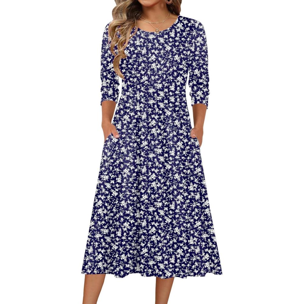 Zeagoo 3/4 Sleeve Women’s Dress Casual Flowy A-Line Midi Tshirt Dresses with Pockets Crewneck Vocation Boho Beach Sundress(Xh445)