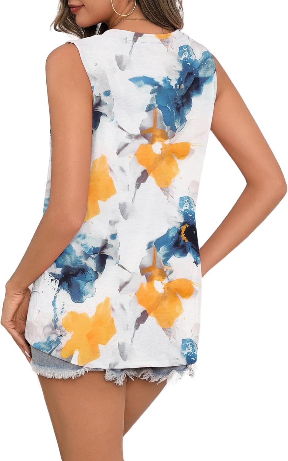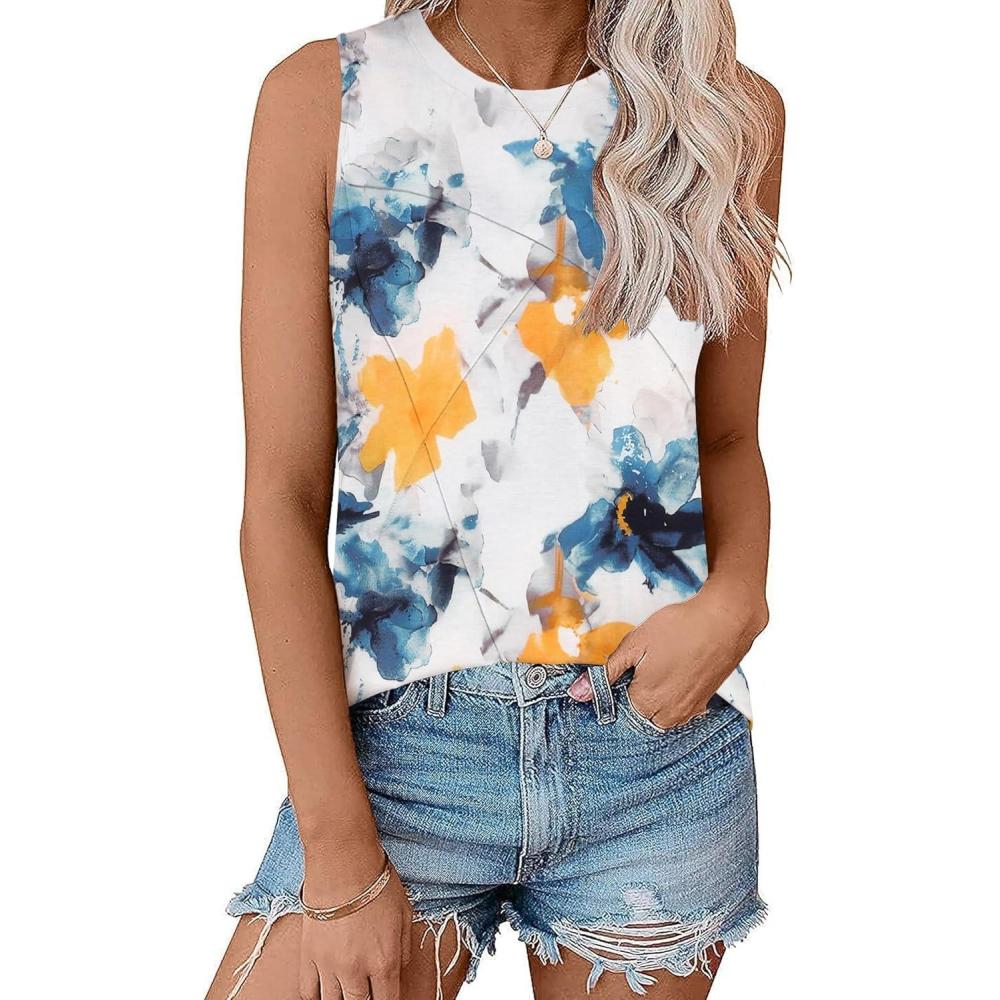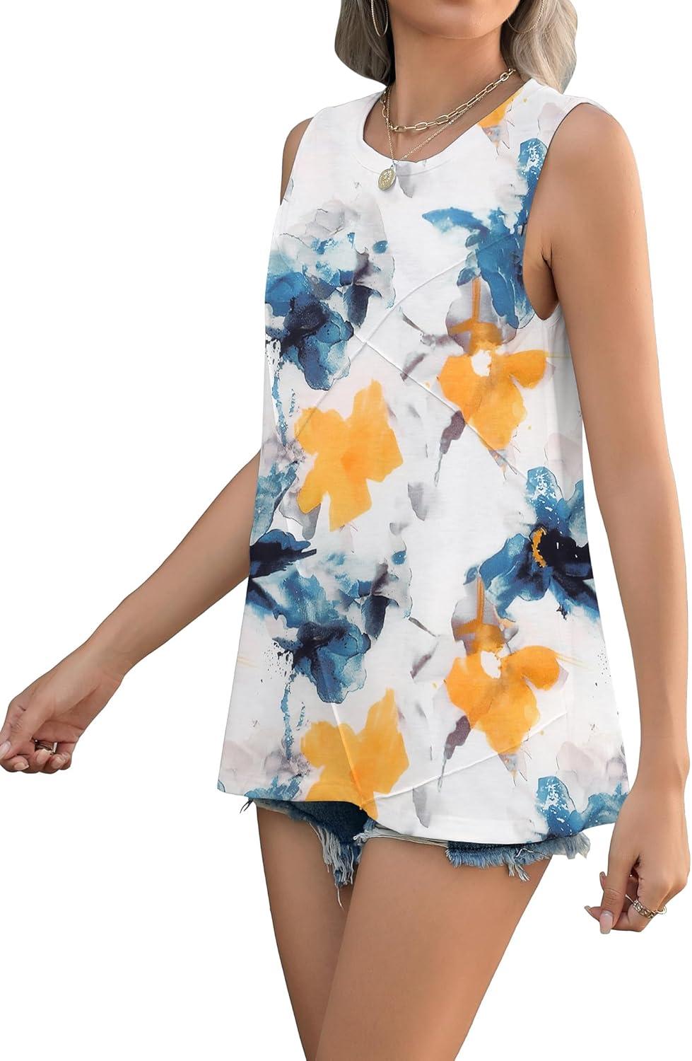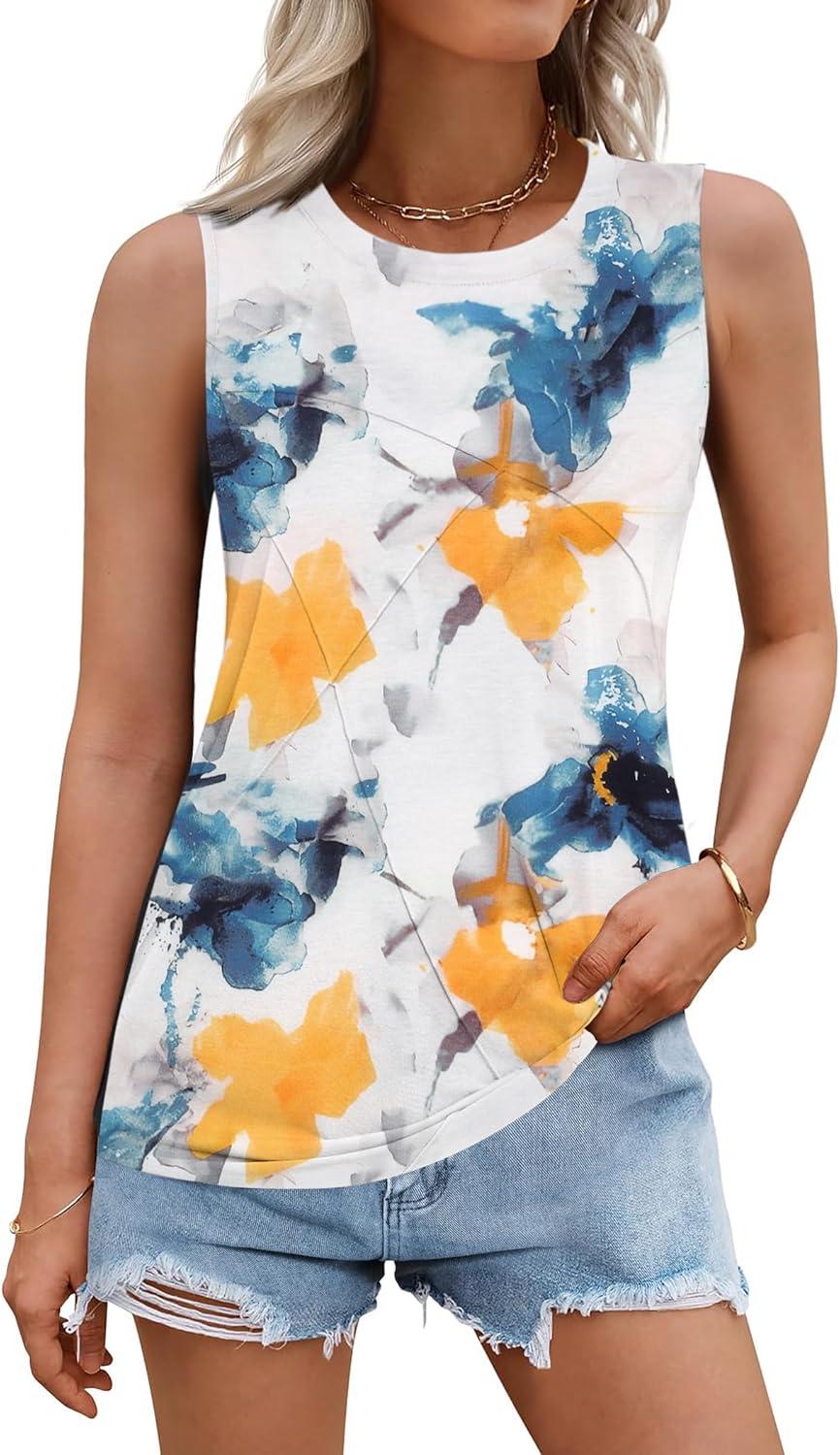 Zeagoo Beach Vacation Clothes for Women Pleated High Neck Flowy Sleeveless Tank Tops Summer Loose Fit Tunic Blouses(White Blue Flower)