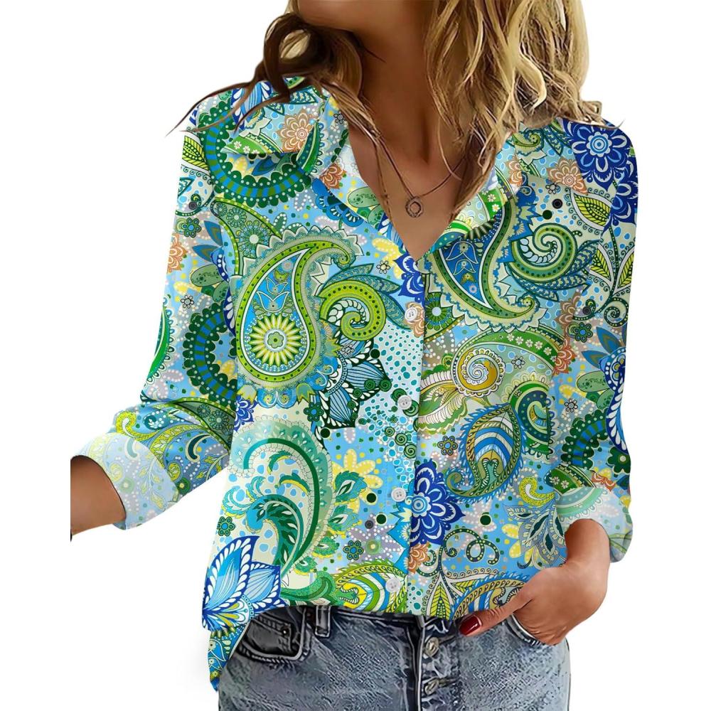 Zeagoo Blouse for Women Dressy Long Sleeve Button Down Shirts Business Casual Outfit Lightweight Solid/Printed Tops(Paisley Green Blue 2)