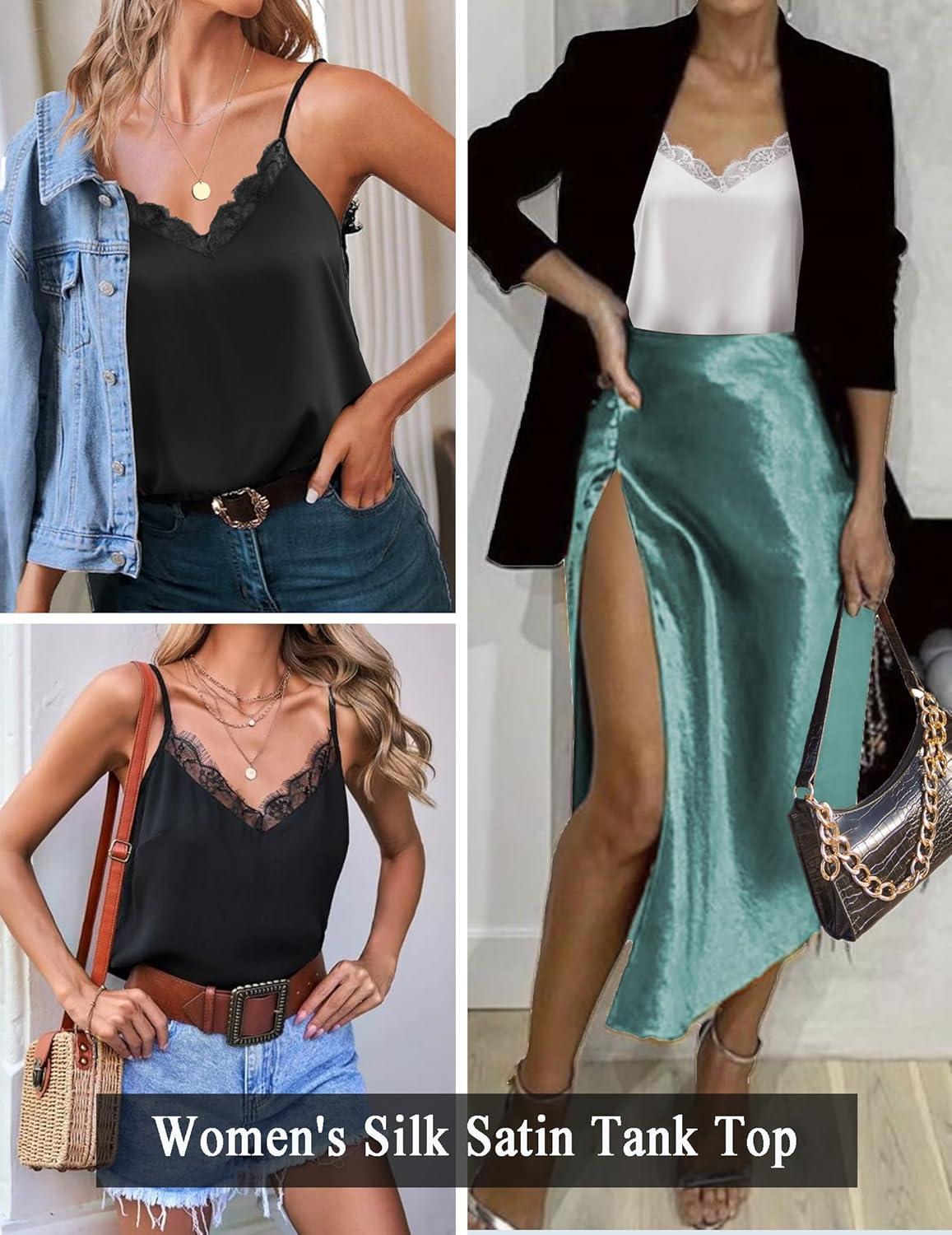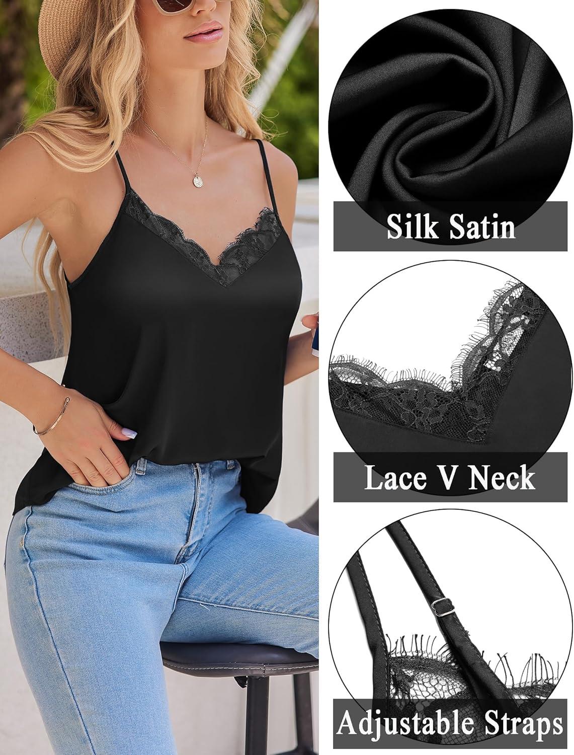 Zeagoo Camisole Tops for Women Slik Satin Spaghetti Strap Tank Top Lace V Neck Cami 2 PCS(Black+white)