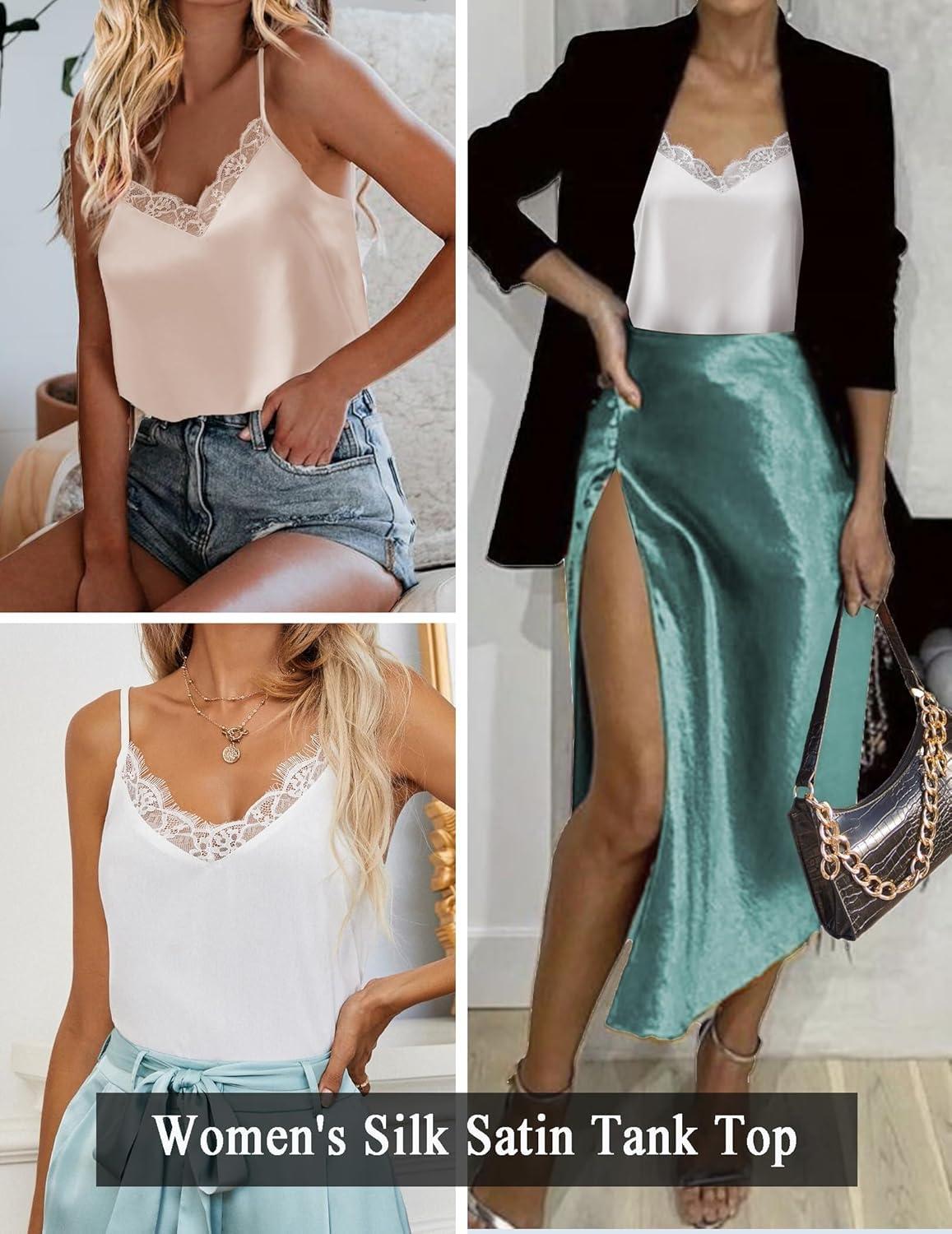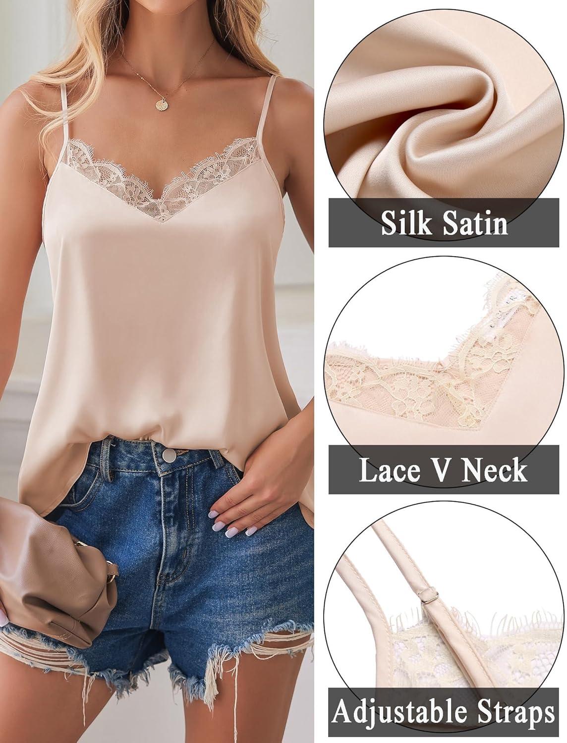 Zeagoo Camisole Tops for Women Slik Satin Spaghetti Strap Tank Top Lace V Neck Cami 2 PCS(White & Champagne2)