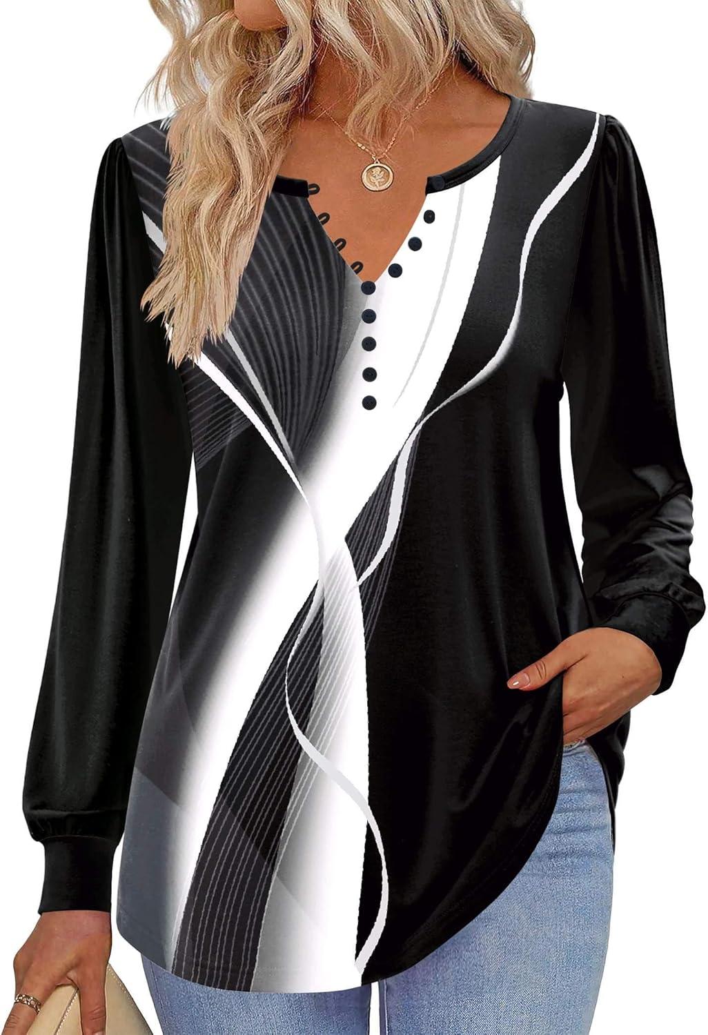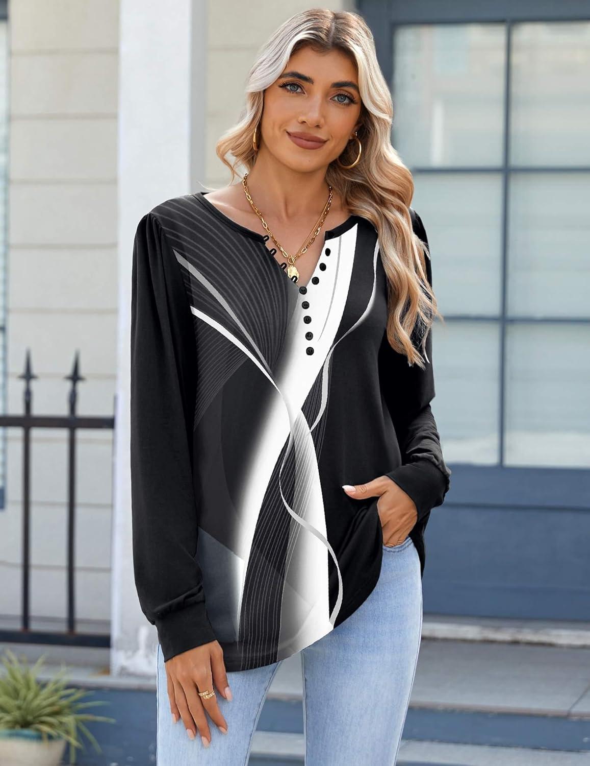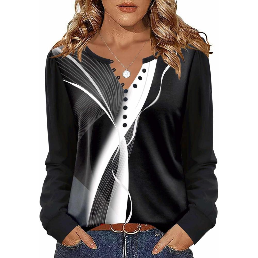Zeagoo Fall Tops for Women Long Sleeve Button Up Shirts Floral Tunics V Neck Pullover Blouse(Black Colorblock)