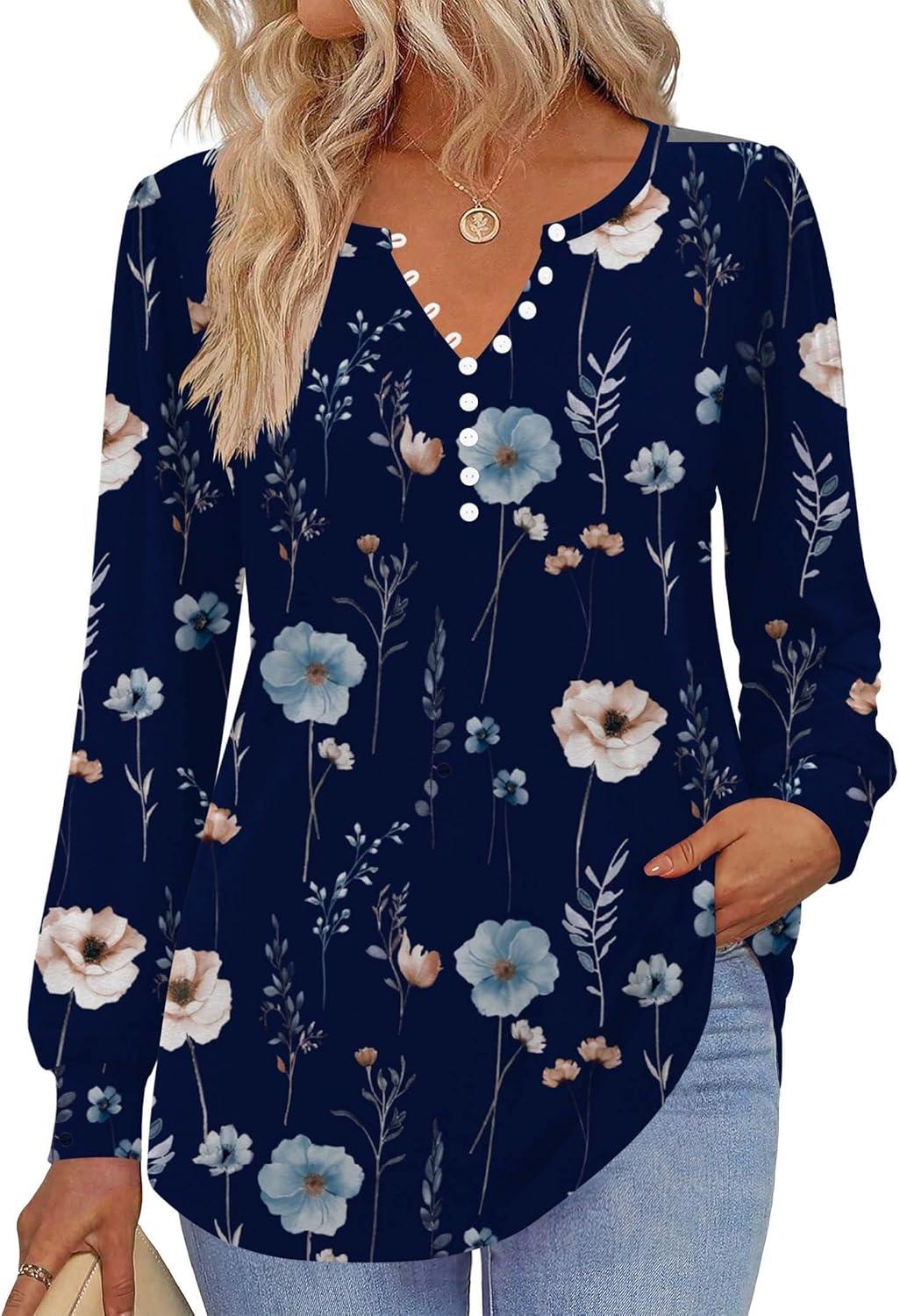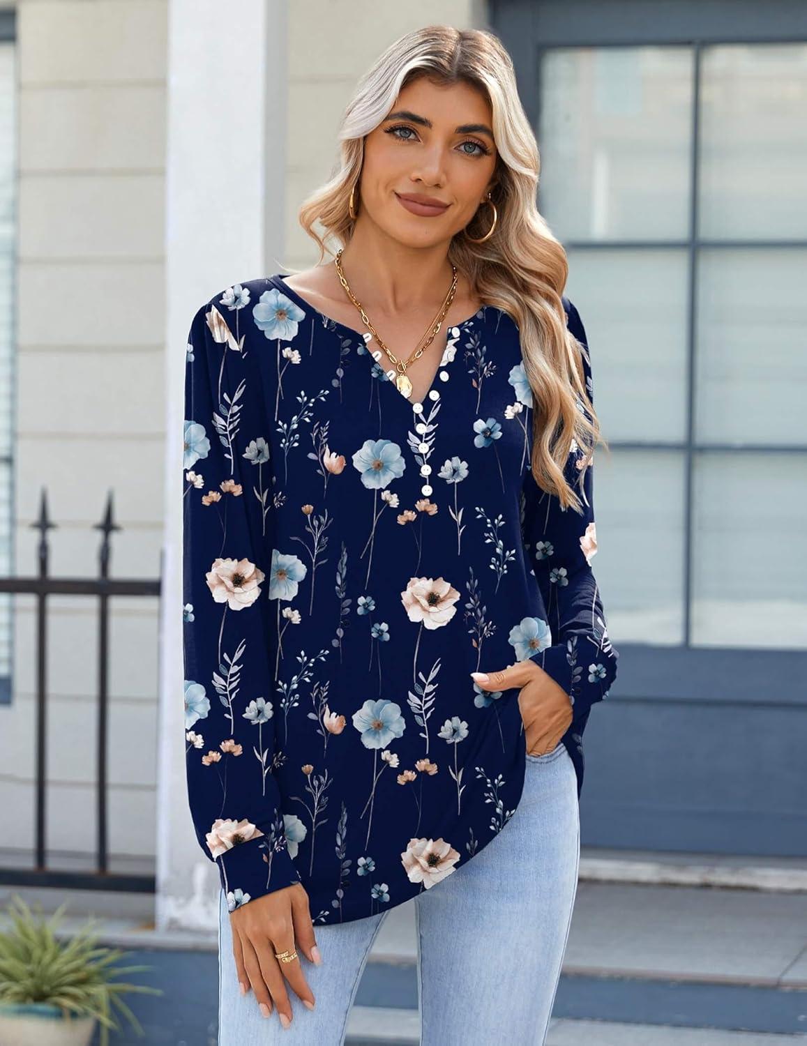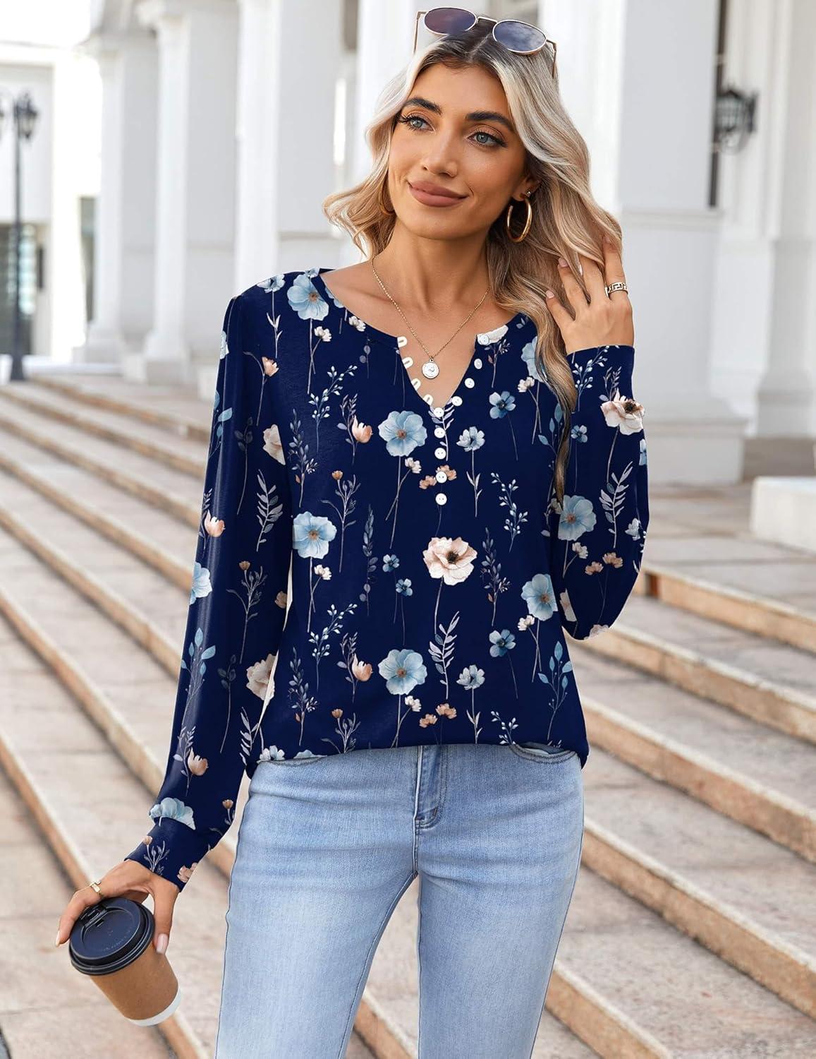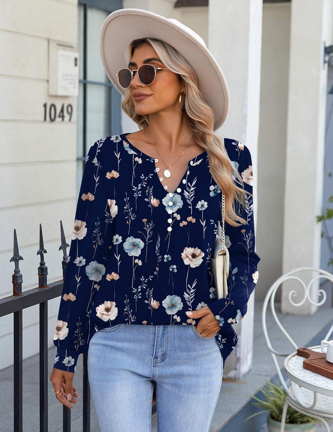 Zeagoo Fall Tops for Women Long Sleeve Button Up Shirts Floral Tunics V Neck Pullover Blouse(Navy Floral)