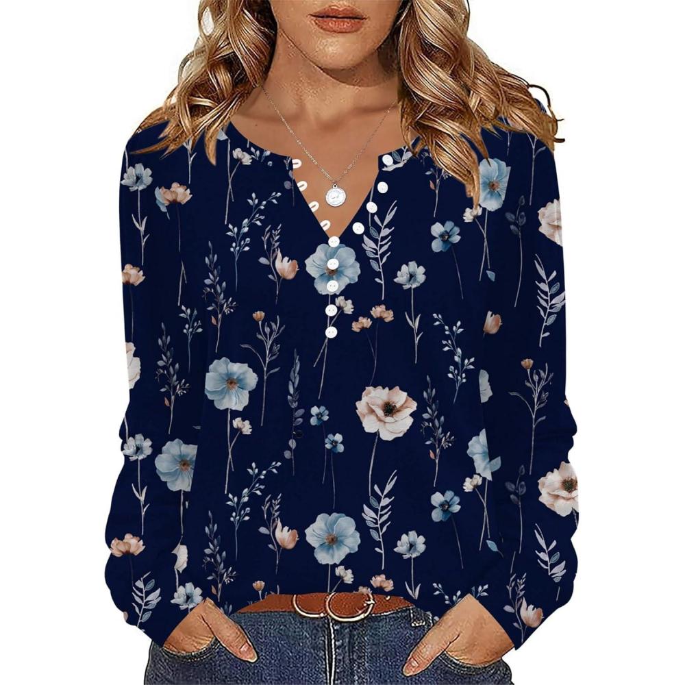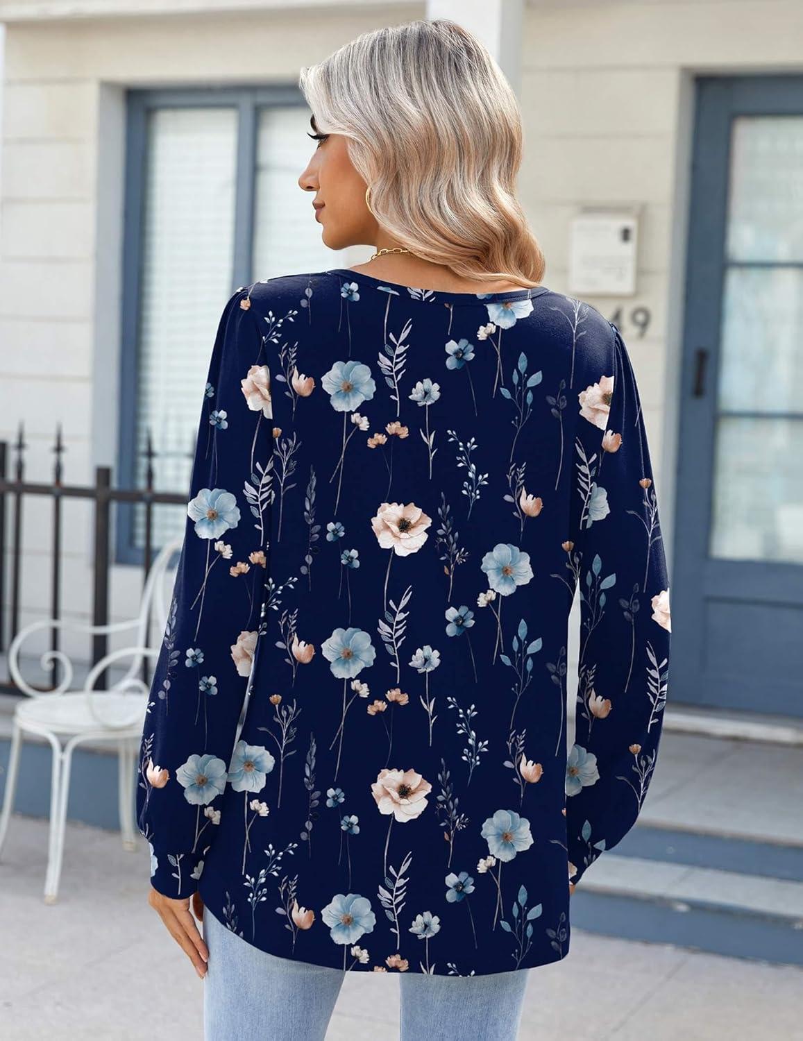 Zeagoo Fall Tops for Women Long Sleeve Button Up Shirts Floral Tunics V Neck Pullover Blouse(Navy Flower)