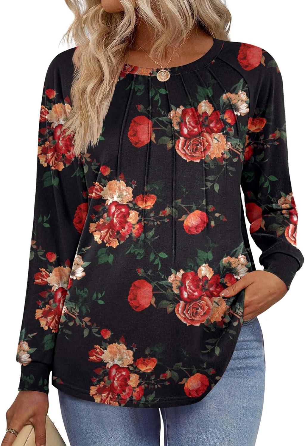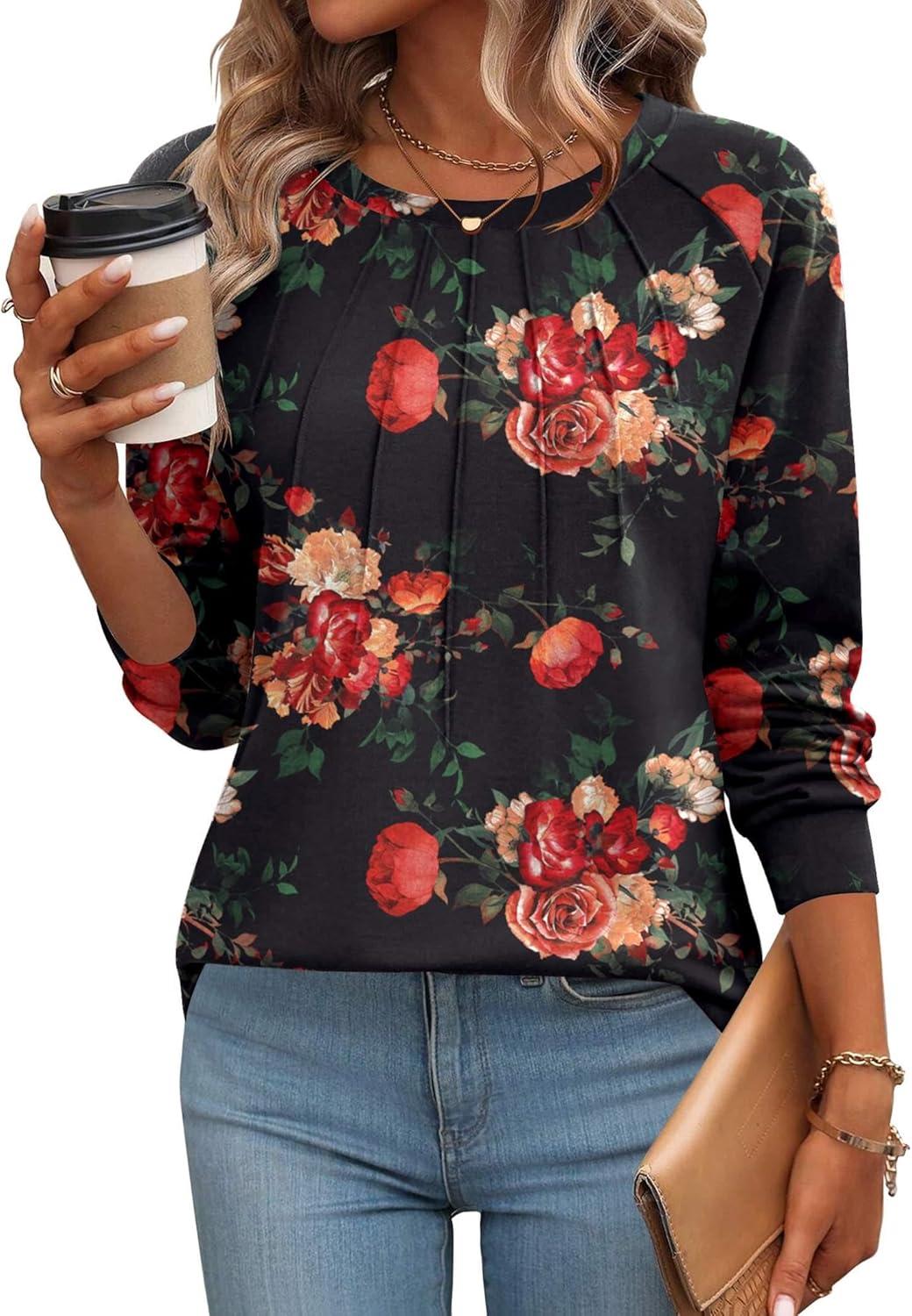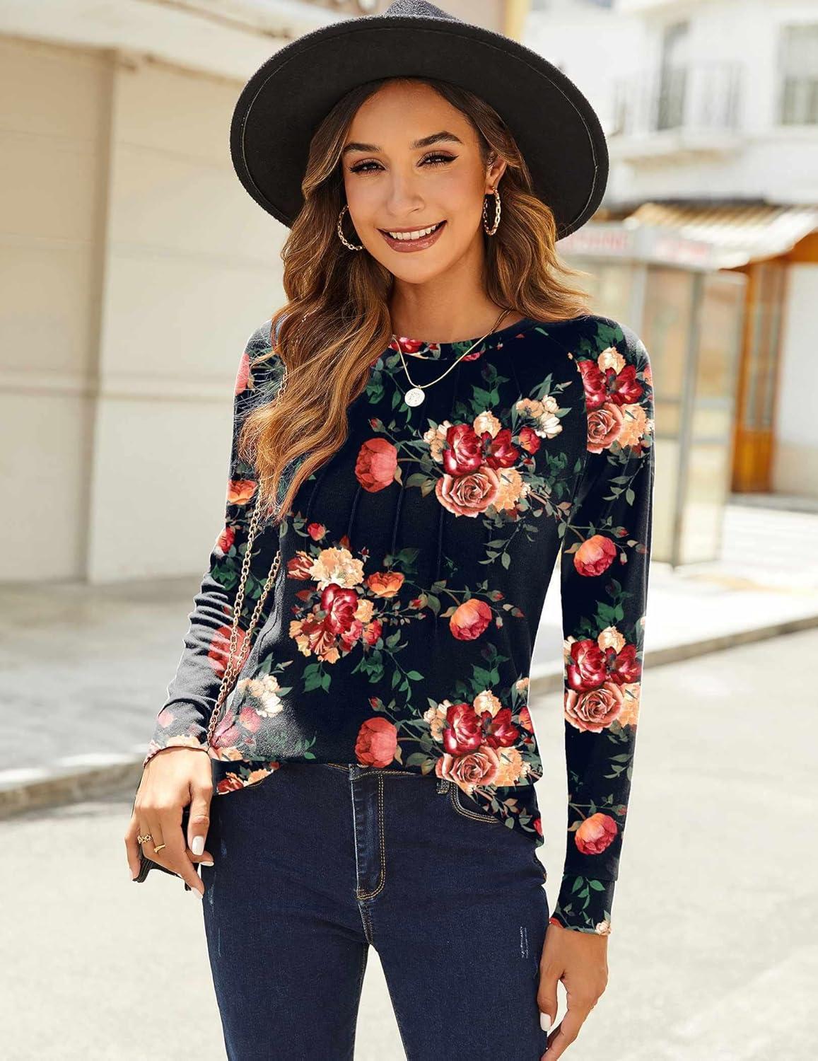 Zeagoo Fall Tops for Women Long Sleeve Shirts Casual Cotton Blouses 2025 Dressy Pleated Tunics(Black Floral)