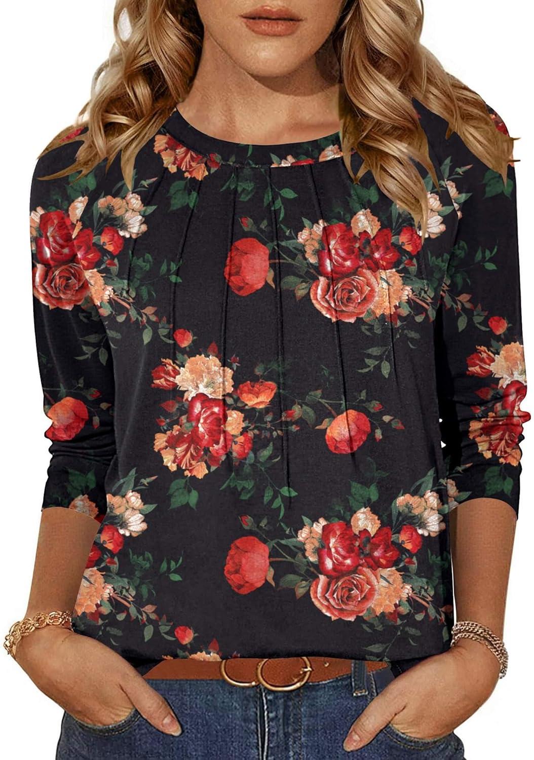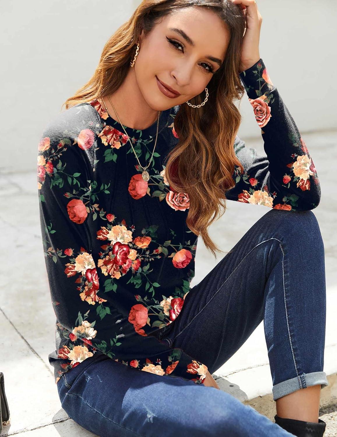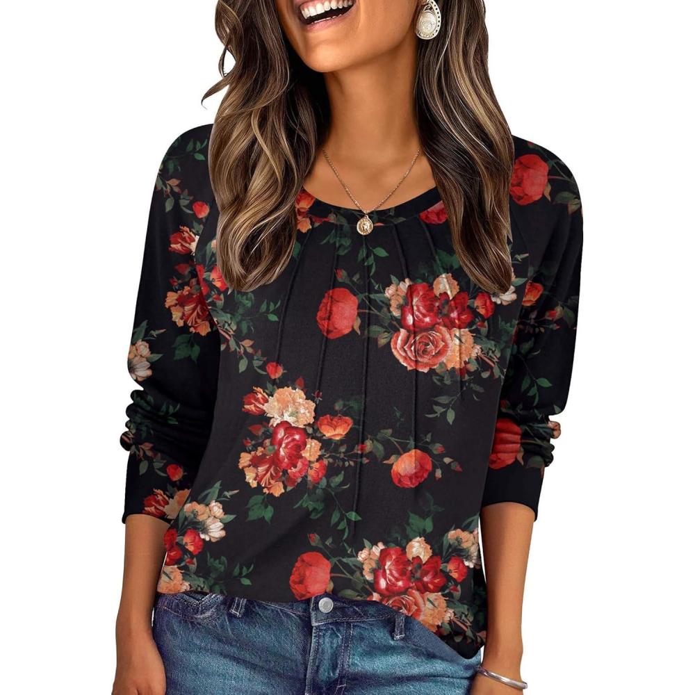Zeagoo Fall Tops for Women Long Sleeve Shirts Casual Cotton Blouses 2025 Dressy Pleated Tunics(Black Floral)