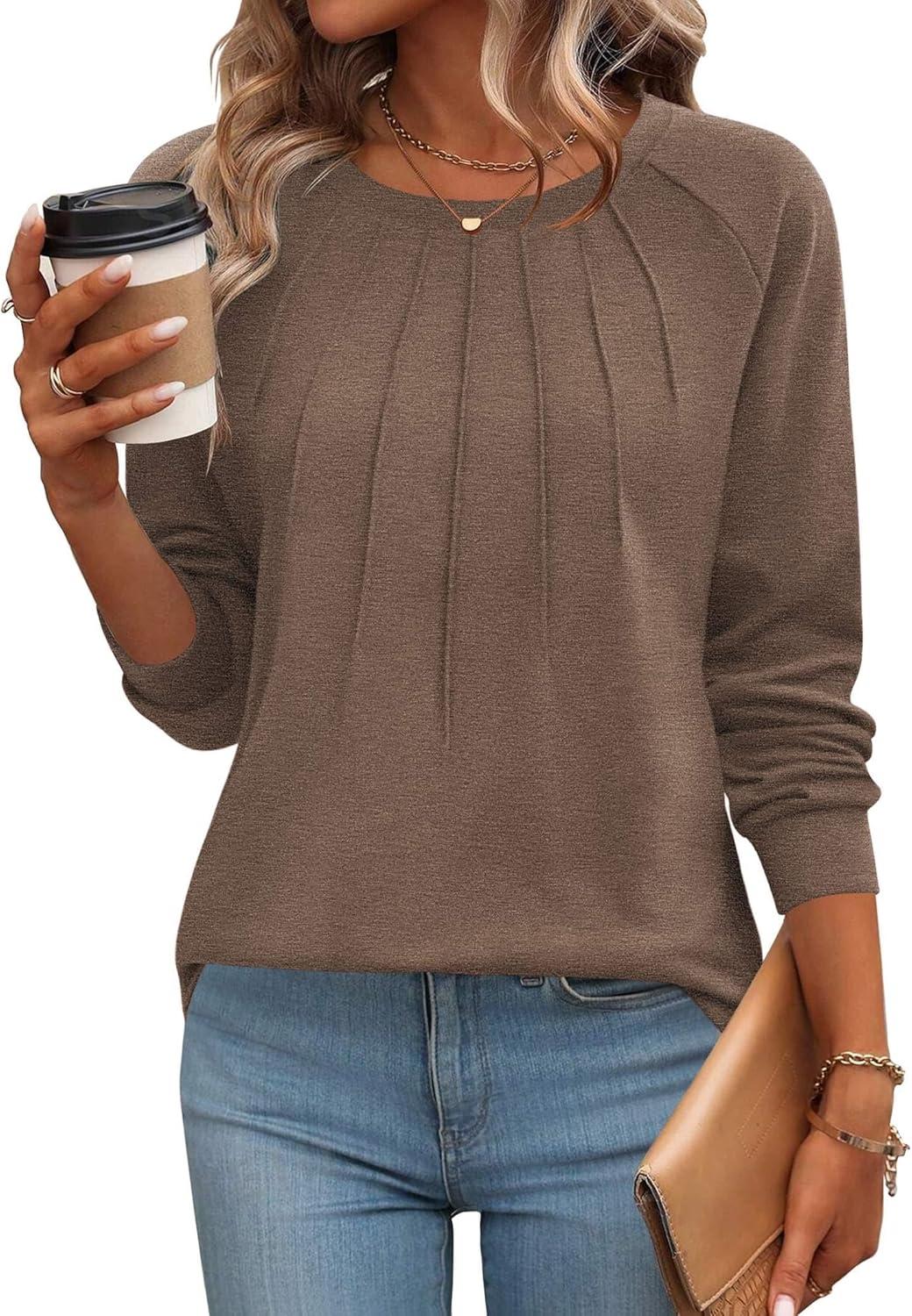 Zeagoo Fall Tops for Women Long Sleeve Shirts Casual Cotton Blouses 2025 Dressy Pleated Tunics(Brown)