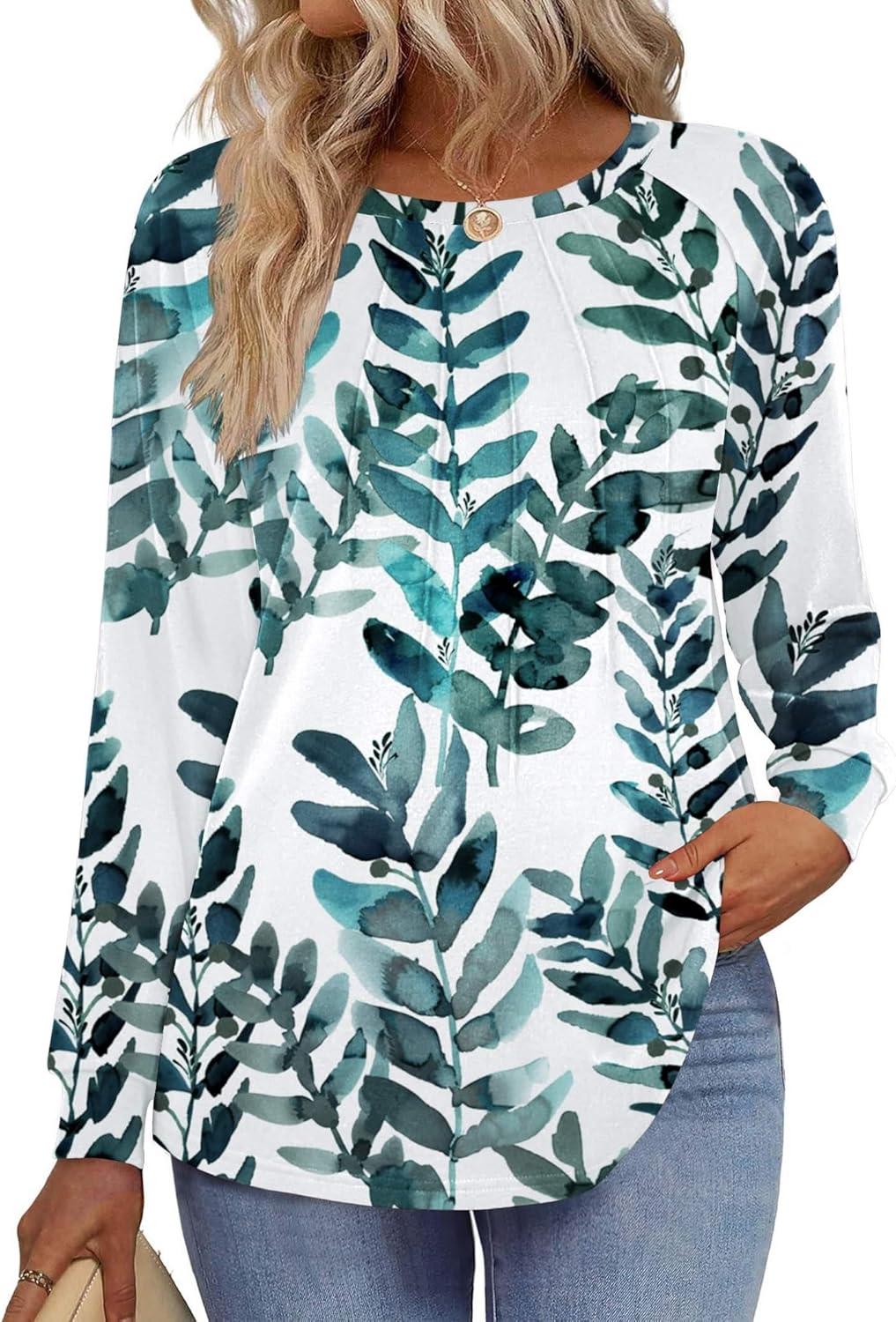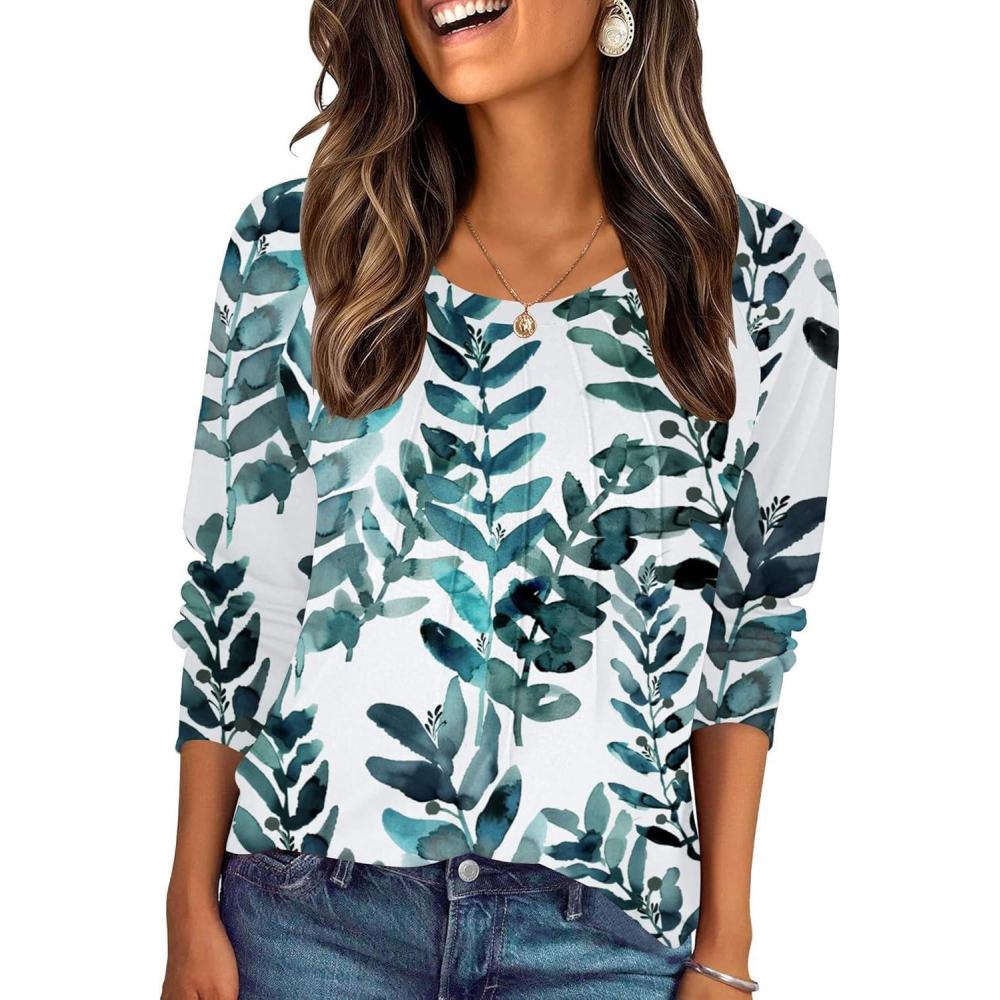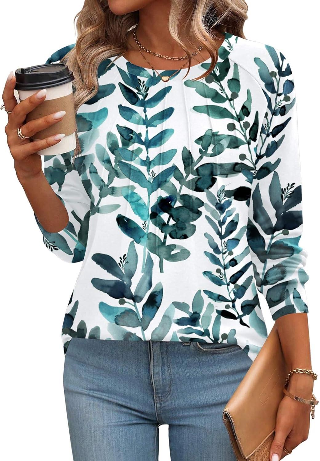 Zeagoo Fall Tops for Women Long Sleeve Shirts Casual Cotton Blouses 2025 Dressy Pleated Tunics(Leaf Print)