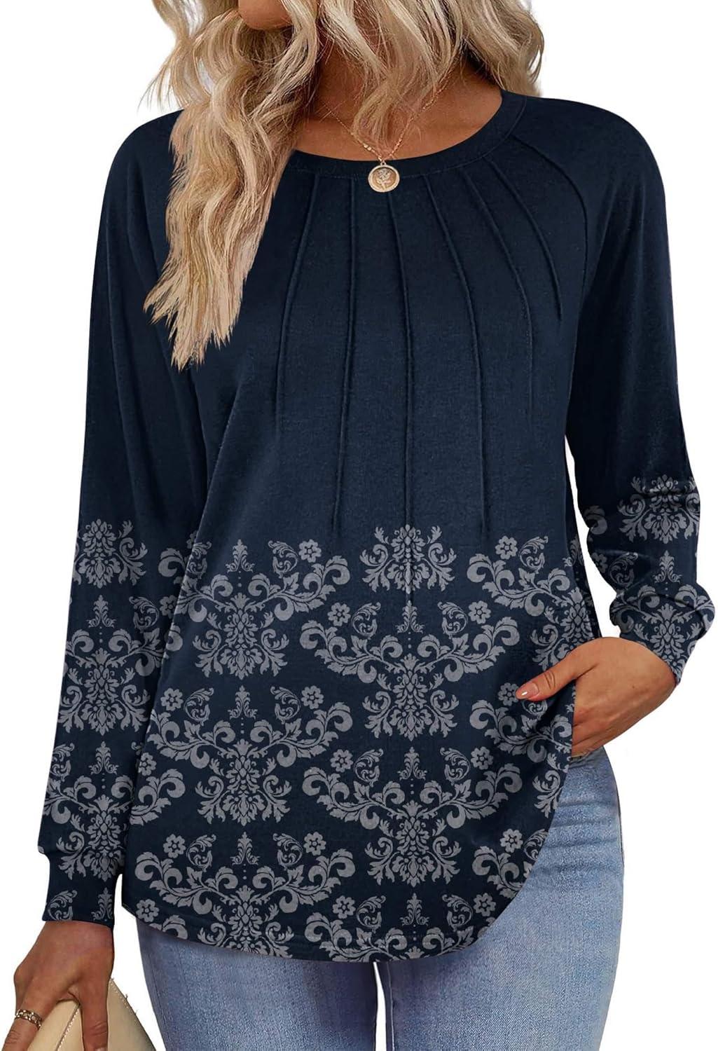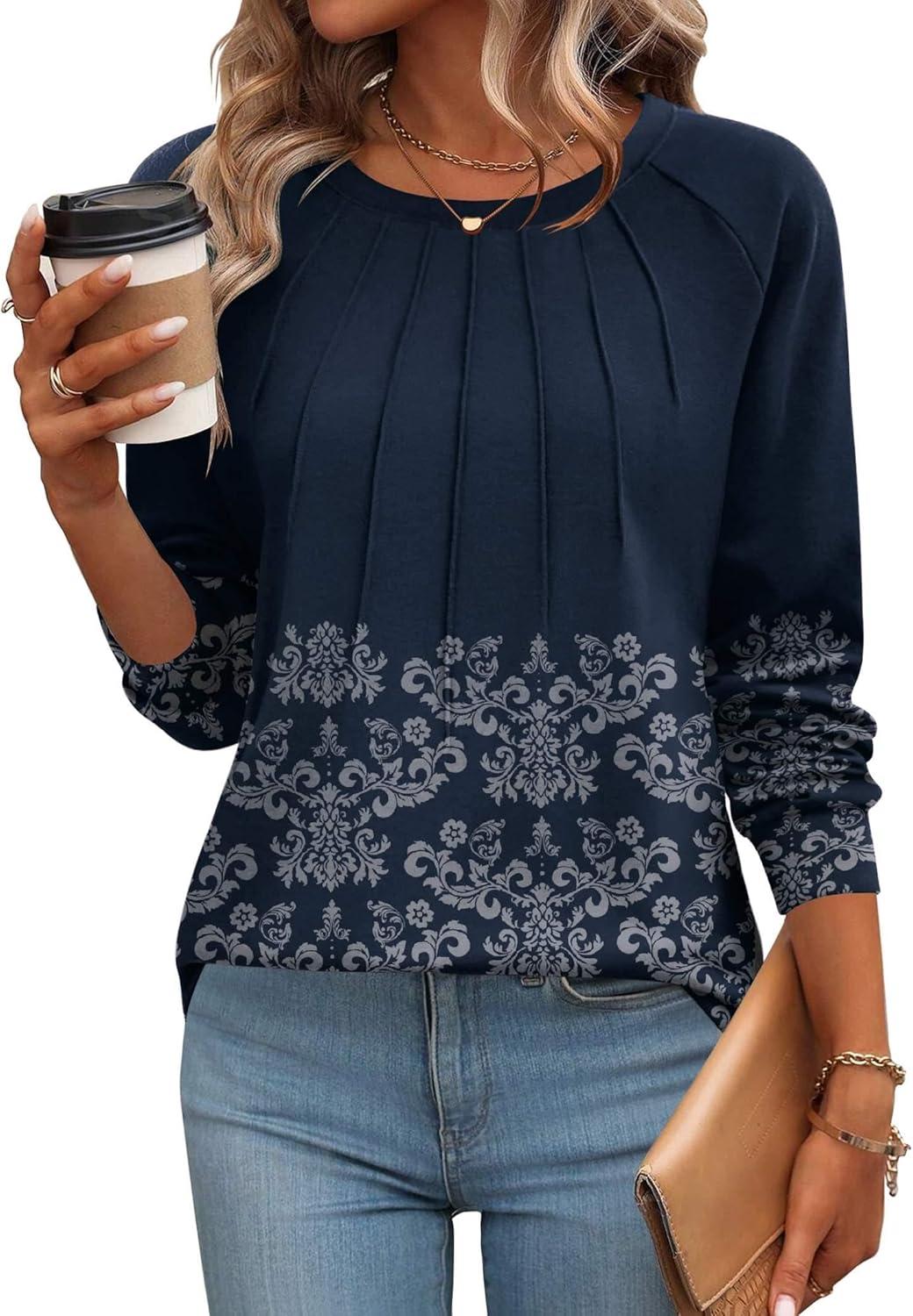 Zeagoo Fall Tops for Women Long Sleeve Shirts Casual Cotton Blouses 2025 Dressy Pleated Tunics(Navy Print)