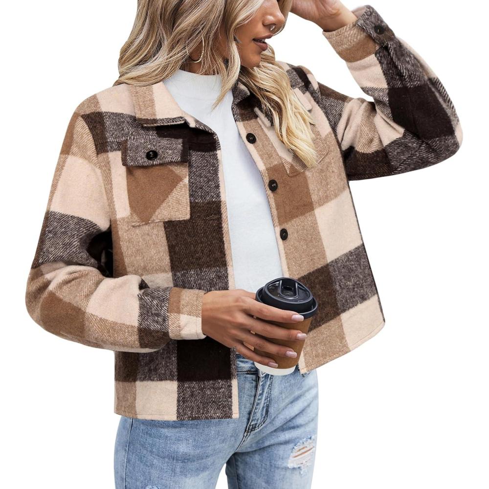 image:imageZeagoo Flannels for Women Cropped Shacket Jacket Fashion Plaid Button Down Shirt 2026 Fall Coat TopsYdl8