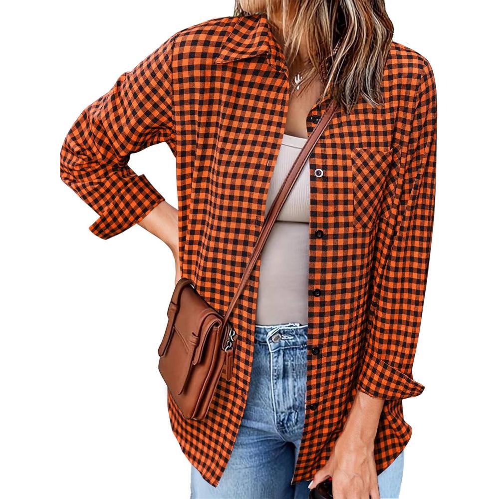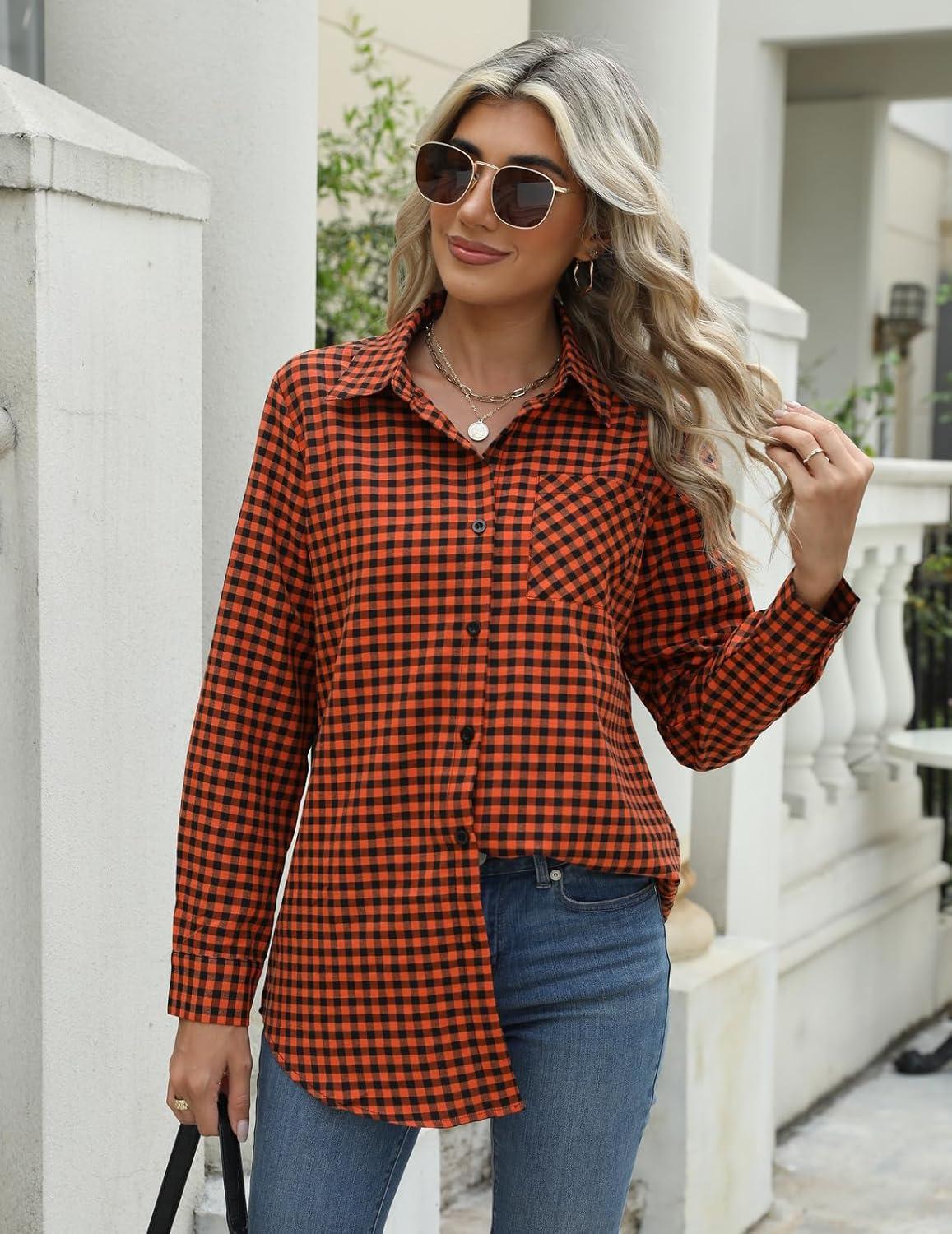 Zeagoo Long Sleeve Plaid Shirt for Women Button Down Shirts Buffalo Shackets Business Casual Blouses(Orange)