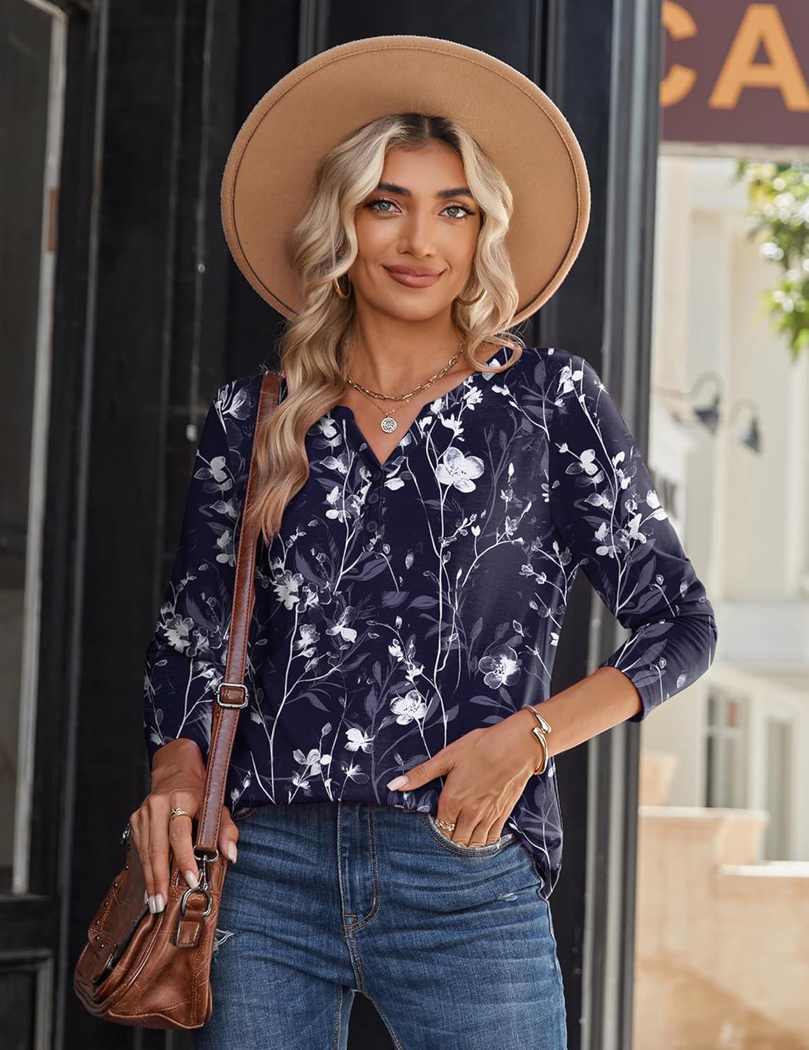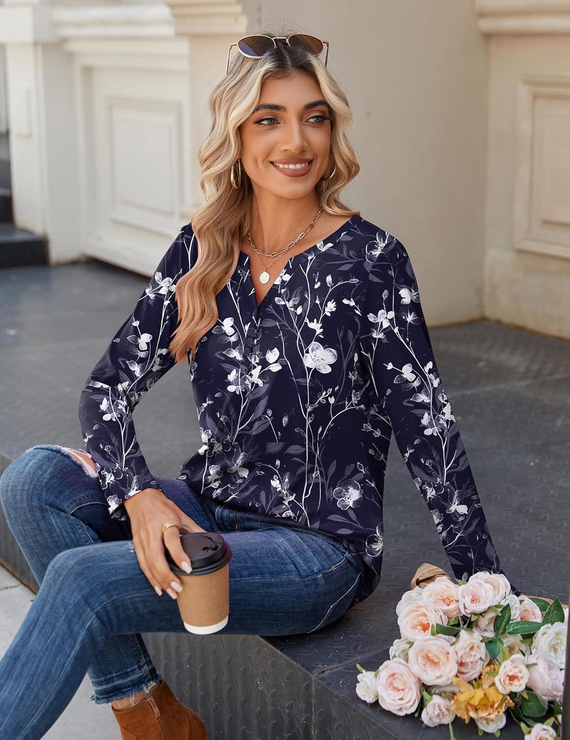Zeagoo Long Sleeve Shirts for Women Casual V Neck Fall Tops Dressy Summer Work Blouses Clothes(Navy Floral 180)
