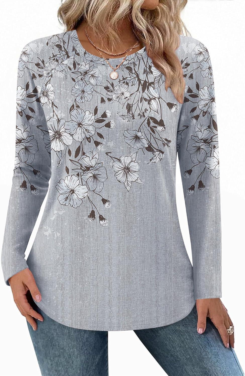 Zeagoo Long Sleeve Shirts for Women Crew Neck Casual Fall Fashion Blouses Basic Tunic Tops Dressy Work Clothes(Grey Print-dh62)