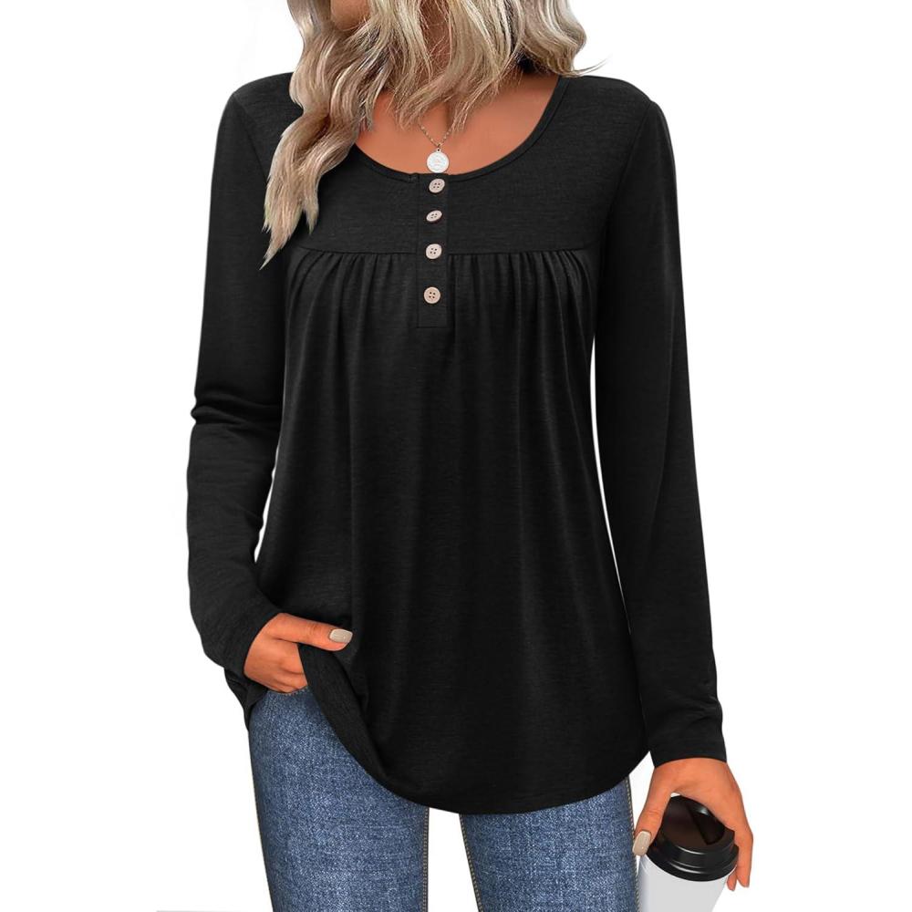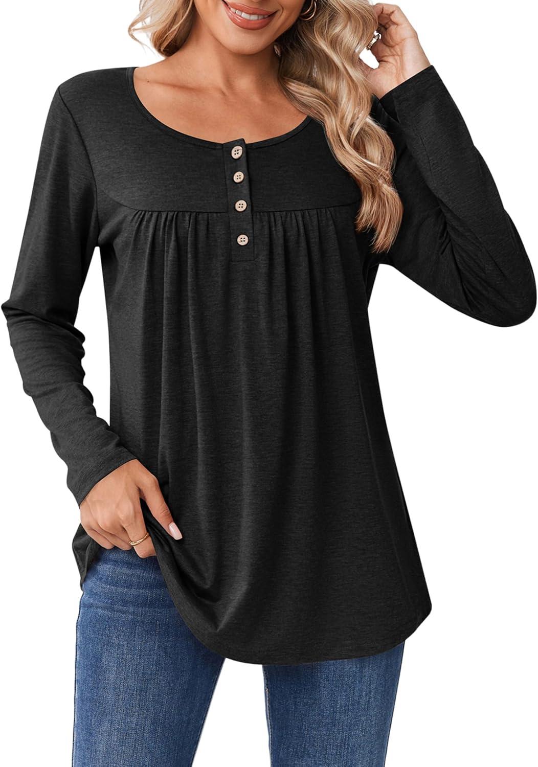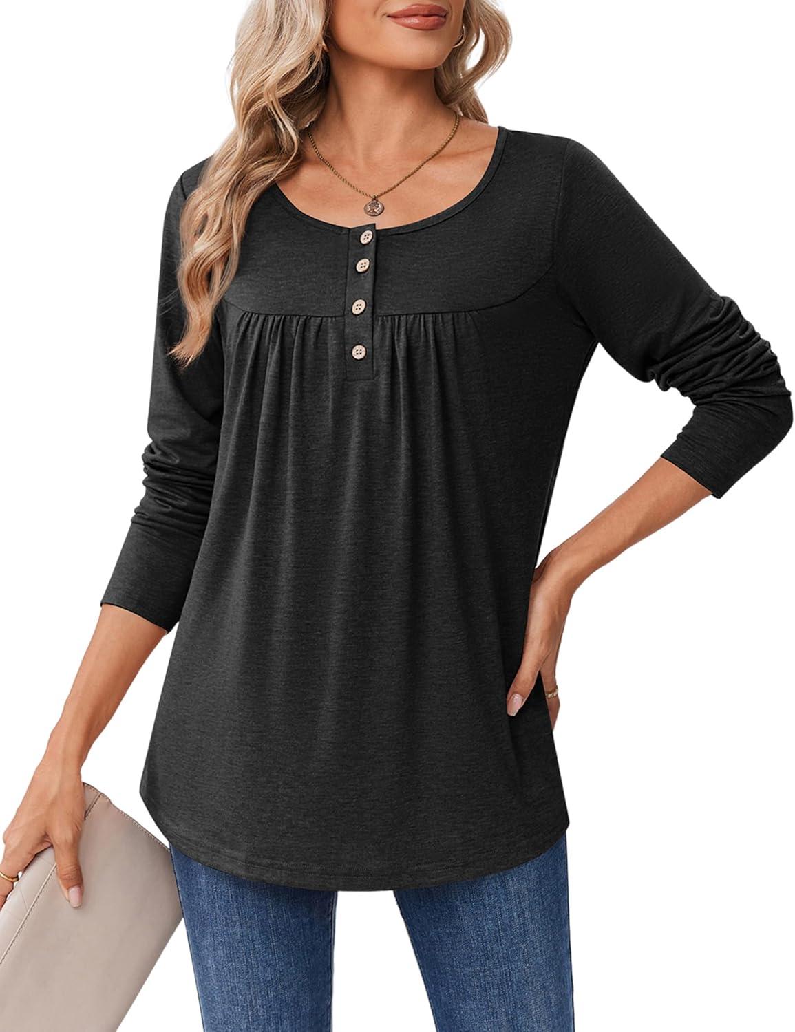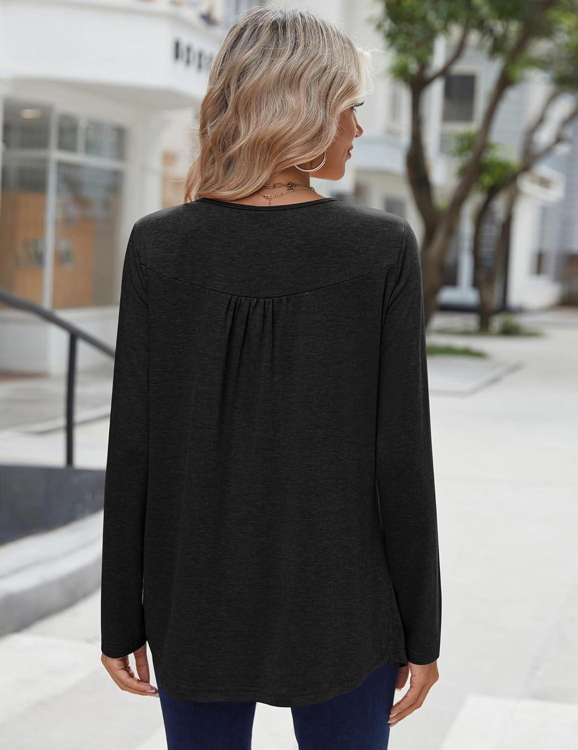 Zeagoo Long Sleeve Shirts for Women Fall Fashion Dressy Casual Blouses Trendy Pleated Tunic Tops for Leggings 2025(Black)