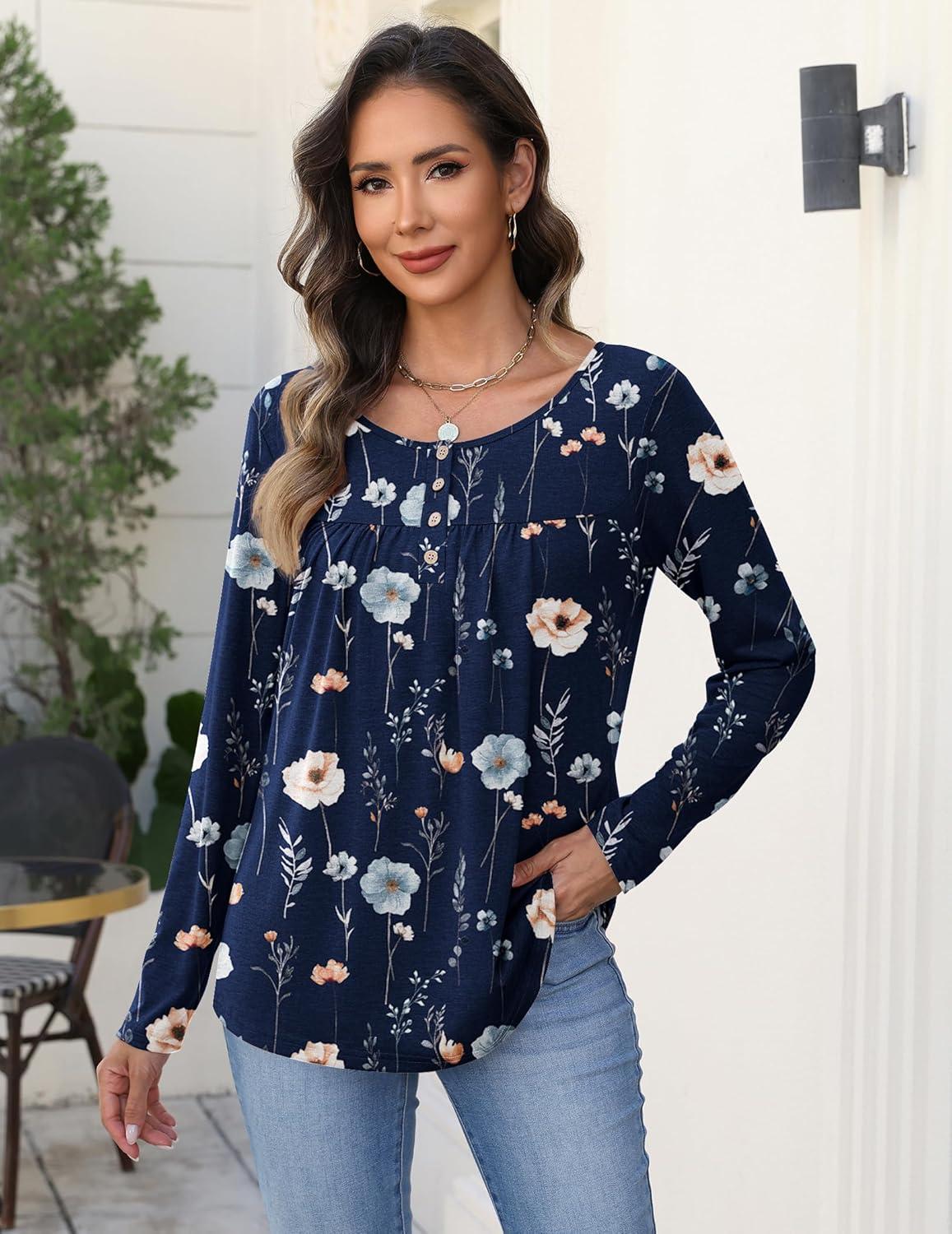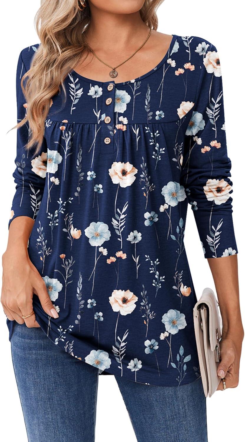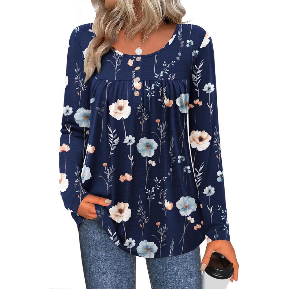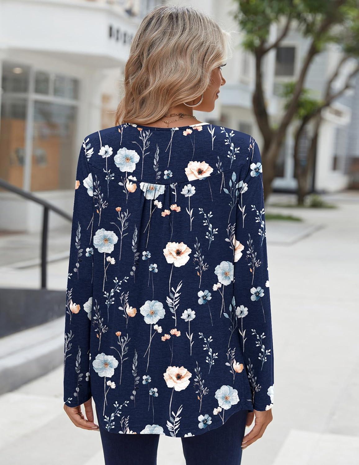 Zeagoo Long Sleeve Shirts for Women Fall Fashion Dressy Casual Blouses Trendy Pleated Tunic Tops for Leggings 2025(Blue Flower-mz845)