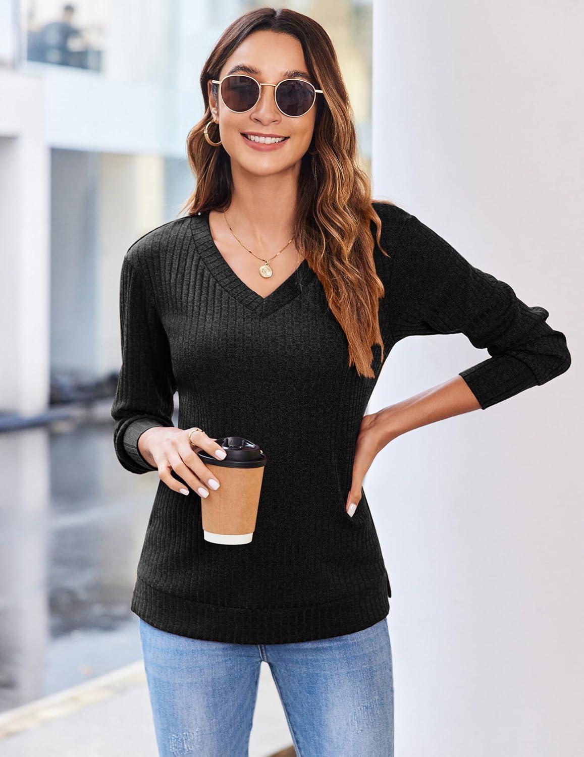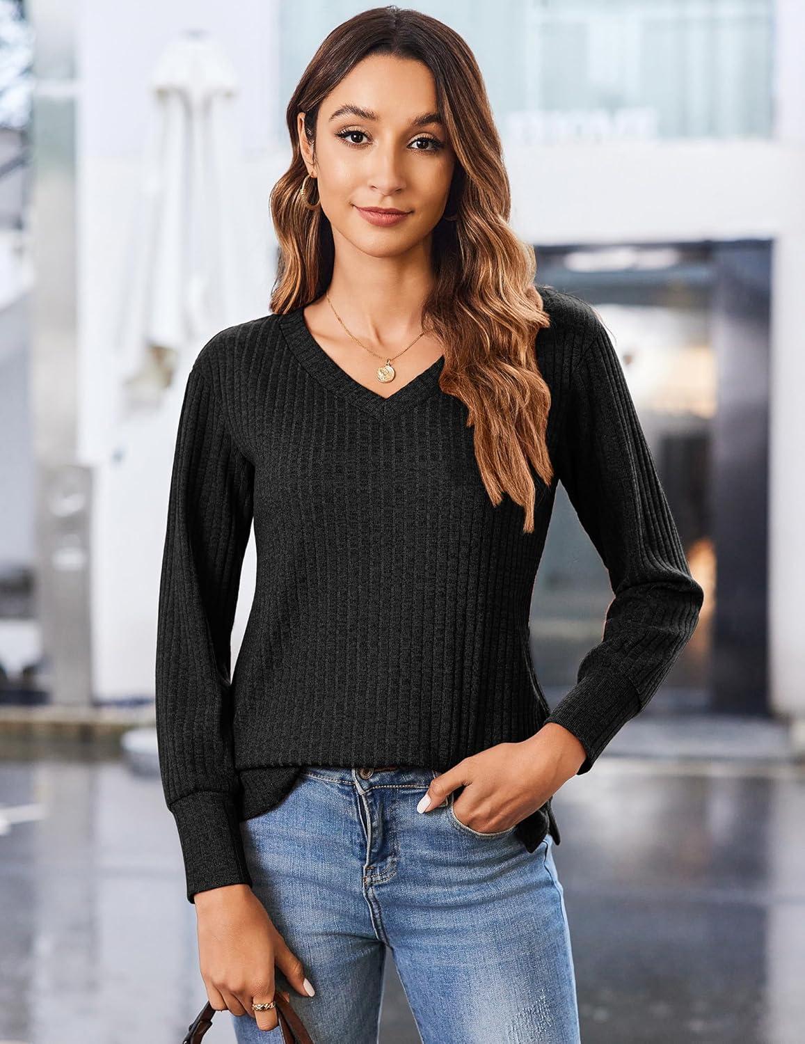 Zeagoo Long Sleeve Shirts for Women V Neck Casual Sweaters Basic Knit 2025 Fall Fashion Pullover Tops(Black)