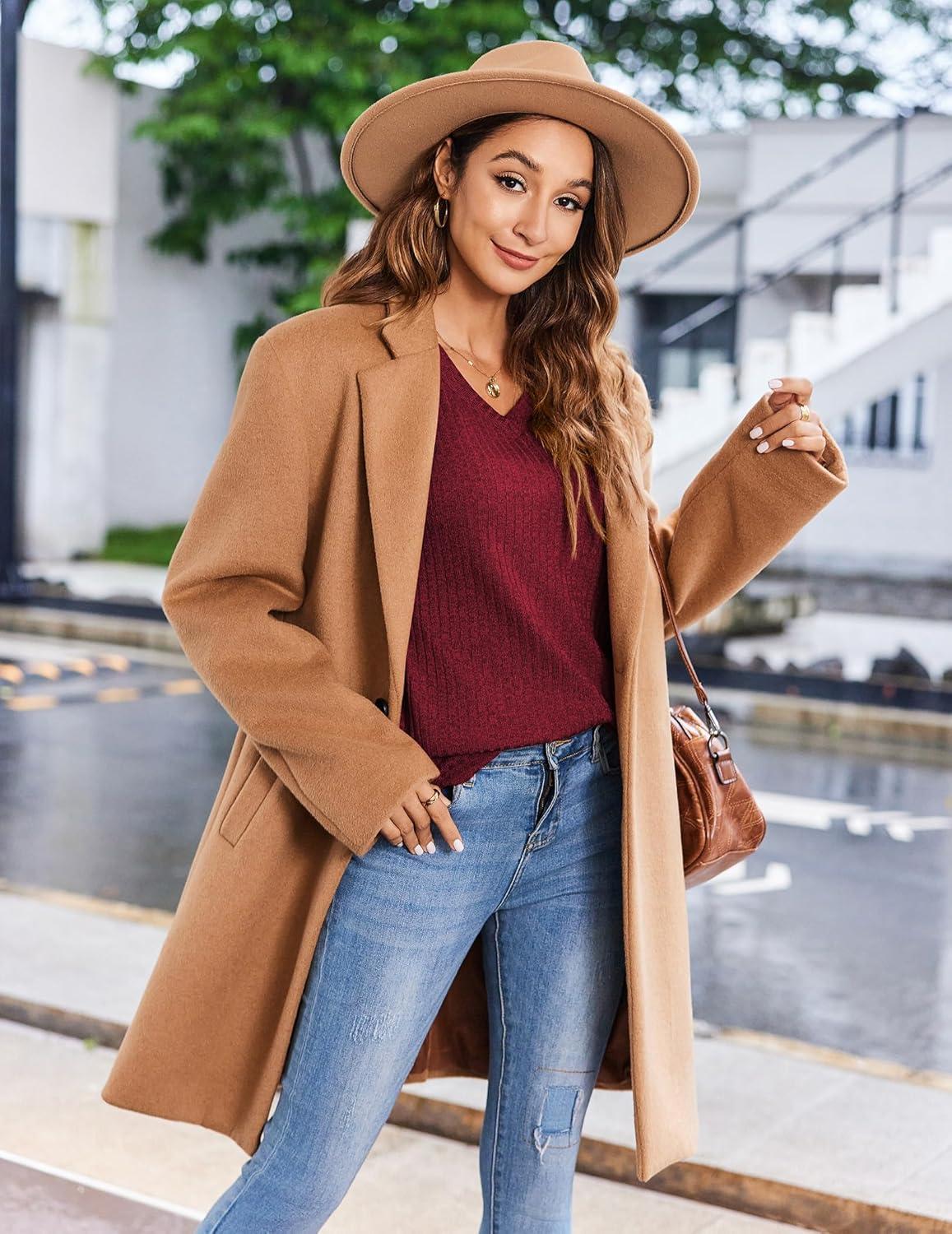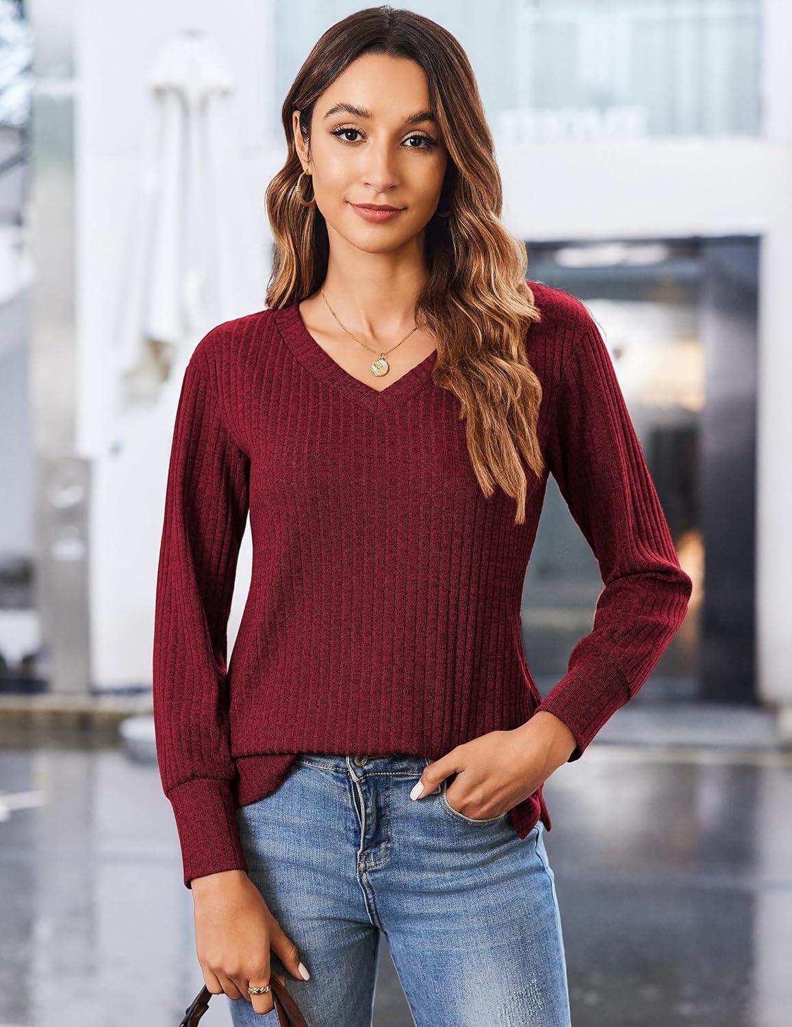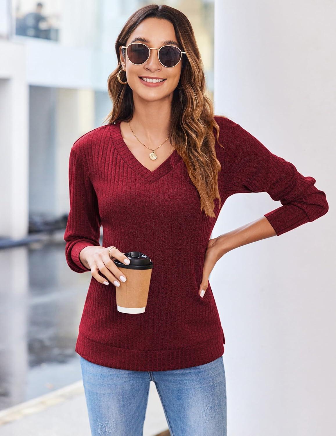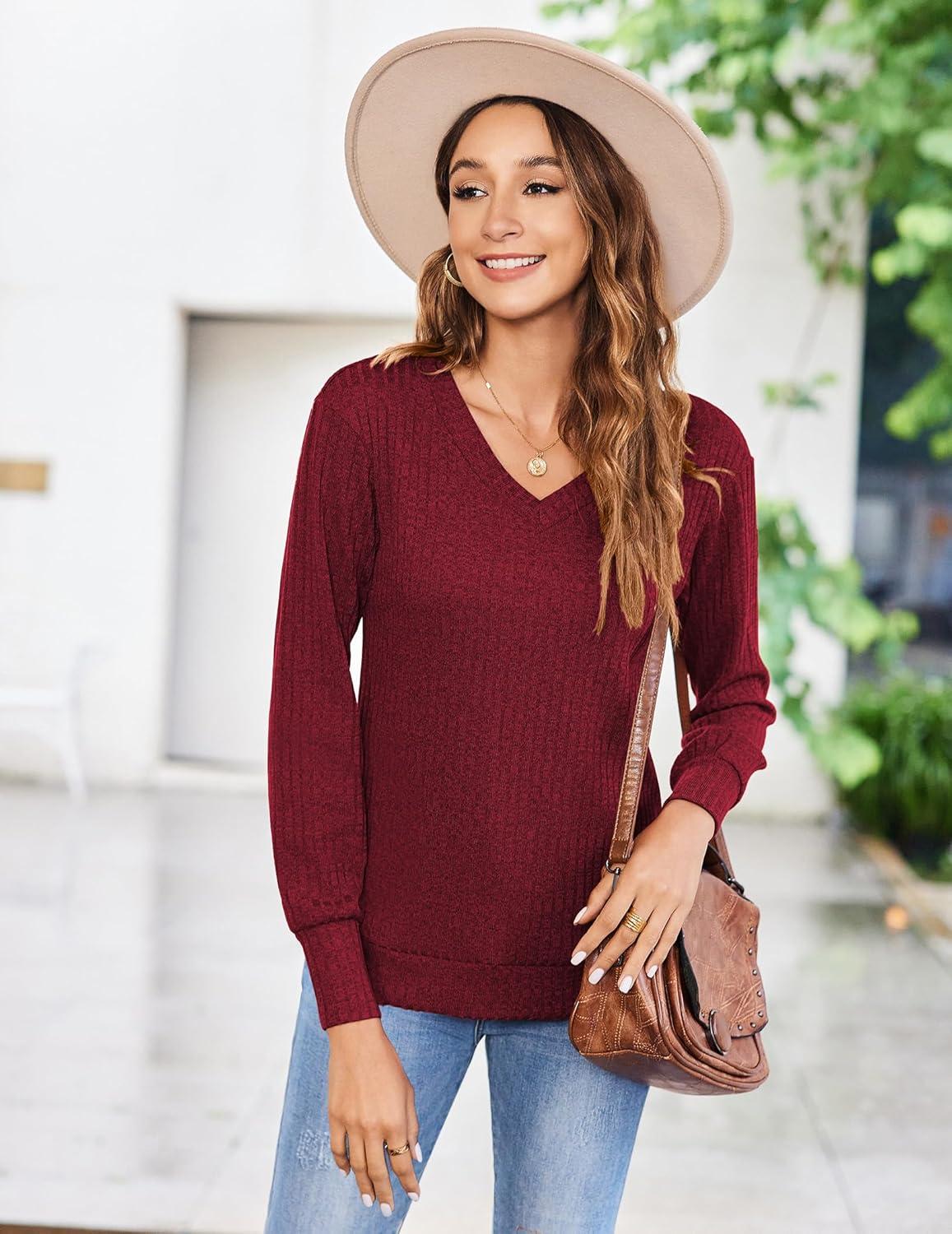 Zeagoo Long Sleeve Shirts for Women V Neck Casual Sweaters Basic Knit 2025 Fall Fashion Pullover Tops(Dark Red)