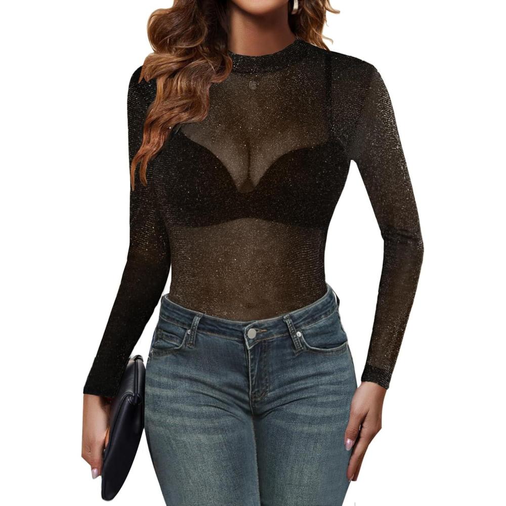 Zeagoo Mesh Top Women Long Sleeve Shirts See Through Party Layering Mock Neck 2024 Fall Sheer Undershirt(Sheer Black)
