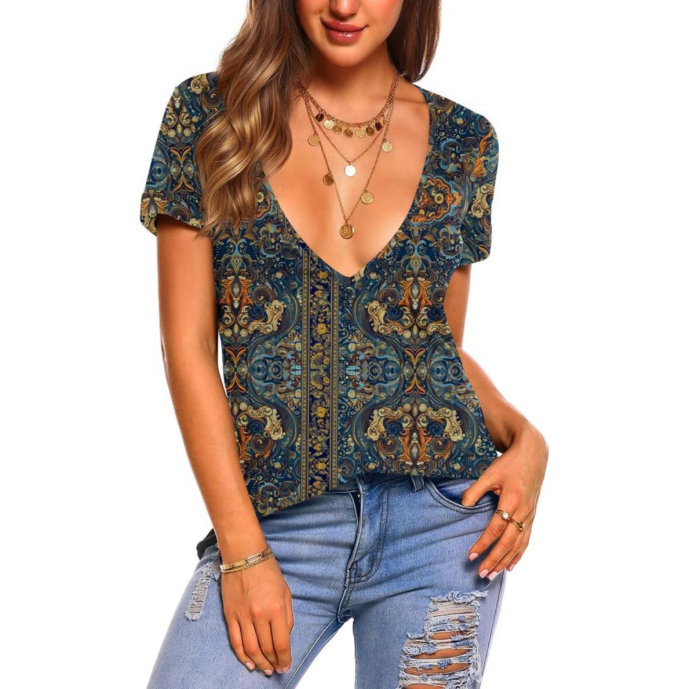 Zeagoo Sexy Tops for Women Deep V Neck Shirts Summer Low Cut Top Short Sleeve Tshirts Trendy Clothes Fashion Clothing(Mz779 Boho)