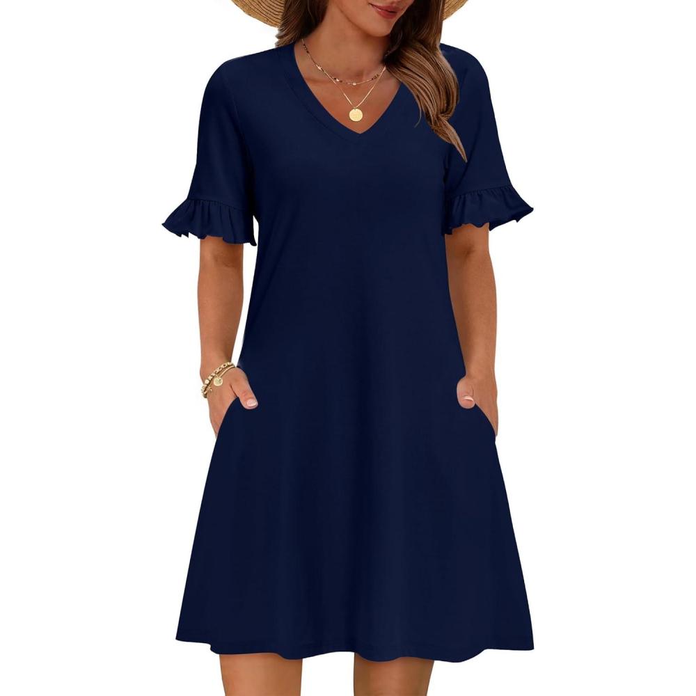 Zeagoo Summer Casual Dresses for Women A Line Sun Dress Ruffle Short Sleeve V Neck Floral Tshirt Dress with Pockets(Navy Blue)