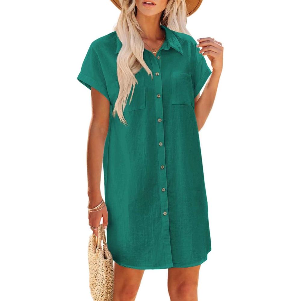 Zeagoo Summer Dresses for Women 2025 Cotton Button Down Short Sleeve Tshirt Dresses Casual Mini Beach Dress(Green 02)
