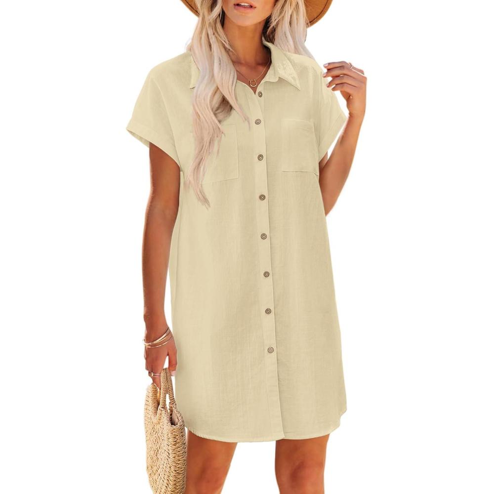 Zeagoo Summer Dresses for Women 2025 Cotton Button Down Short Sleeve Tshirt Dresses Casual Mini Beach Dress(Light Khaki)