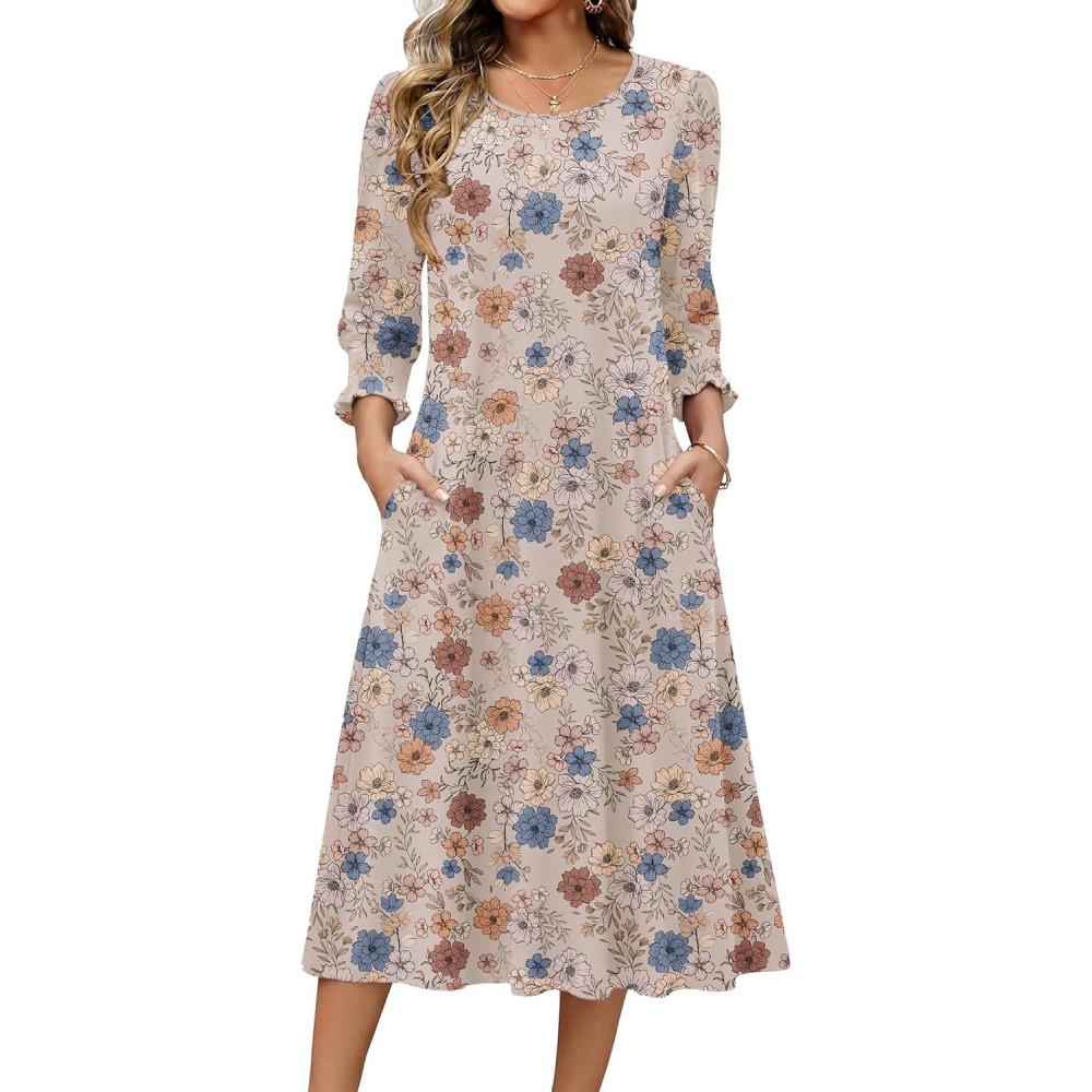 Zeagoo Summer Dresses for Women 2026 3/4 Sleeve Dress for Women Floral Midi Dresses for Casual Womens Dresses with Pockets(Floral-sf119)