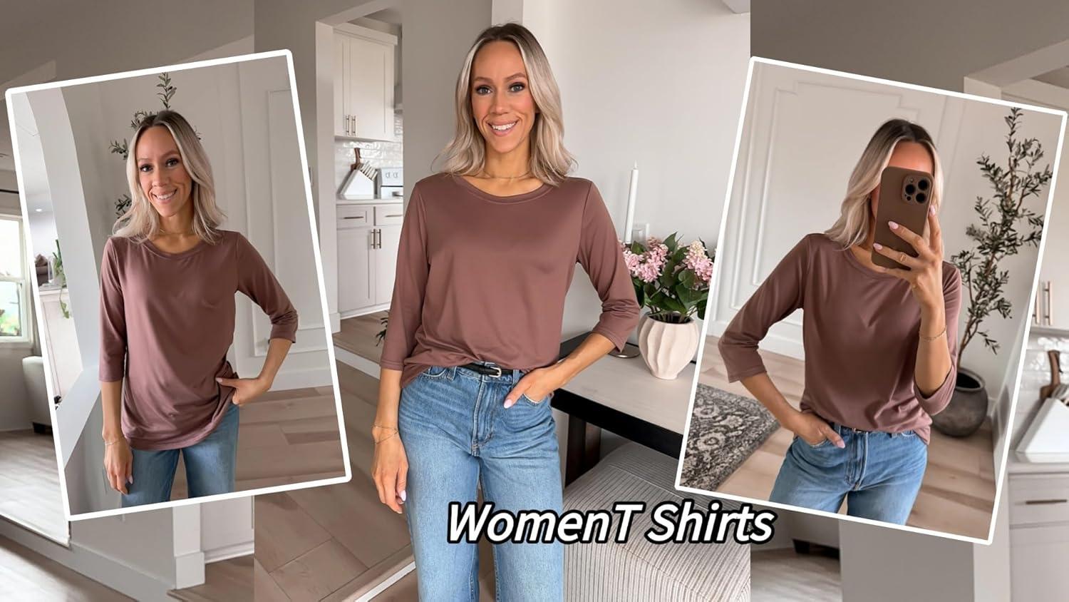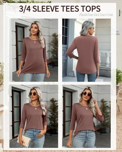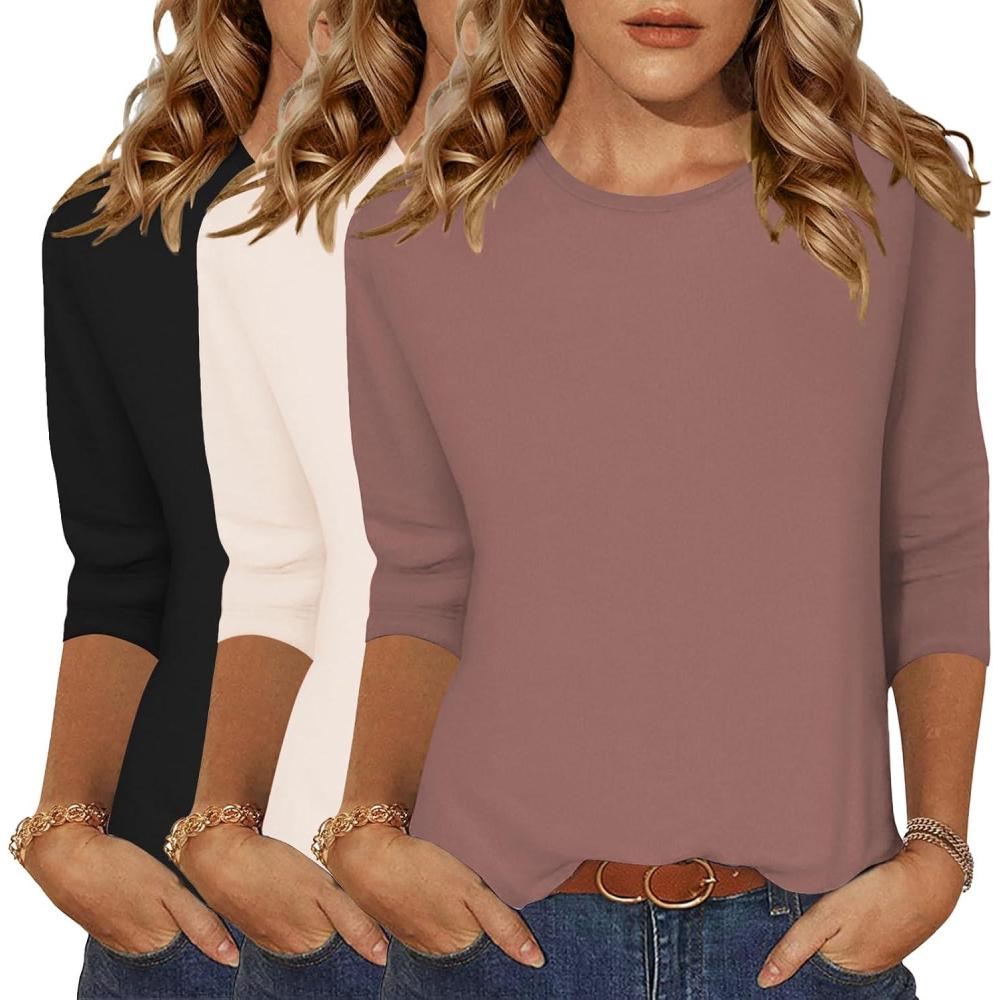 Zeagoo Tops for Women 3 Pack 3/4 Sleeve Crewneck Cute Basics Tees Casual Fashion Summer T Shirts Business Work Tee Top(Black-apricot-coffee)