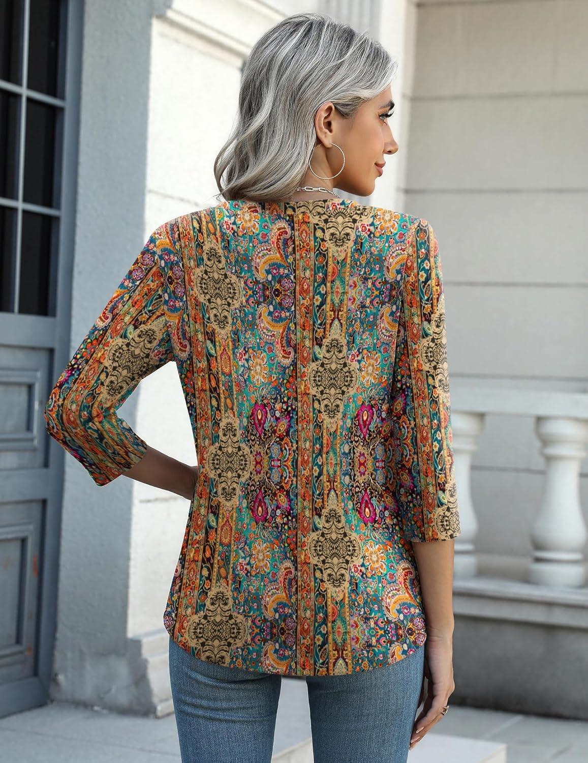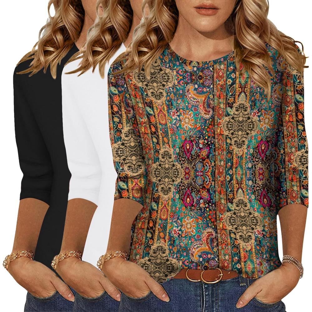 Zeagoo Tops for Women 3 Pack 3/4 Sleeve Crewneck Cute Basics Tees Casual Fashion Summer T Shirts Business Work Tee Top(Black-white-boho Mz721)