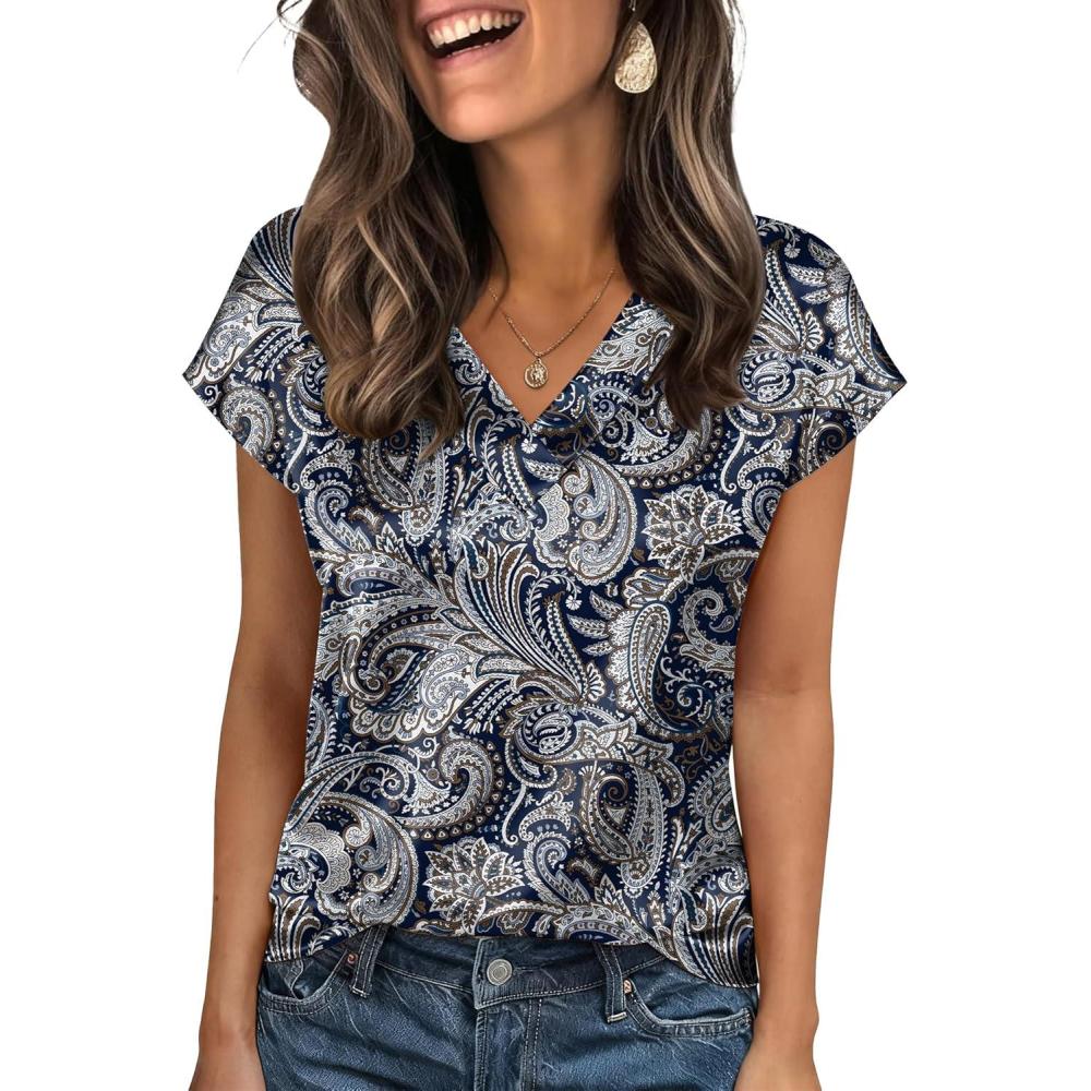 Zeagoo Women Silk Satin Tops Cap Short Sleeve Blouse V Neck Shirts Business Casual Outfits S-2XL(Mz473)