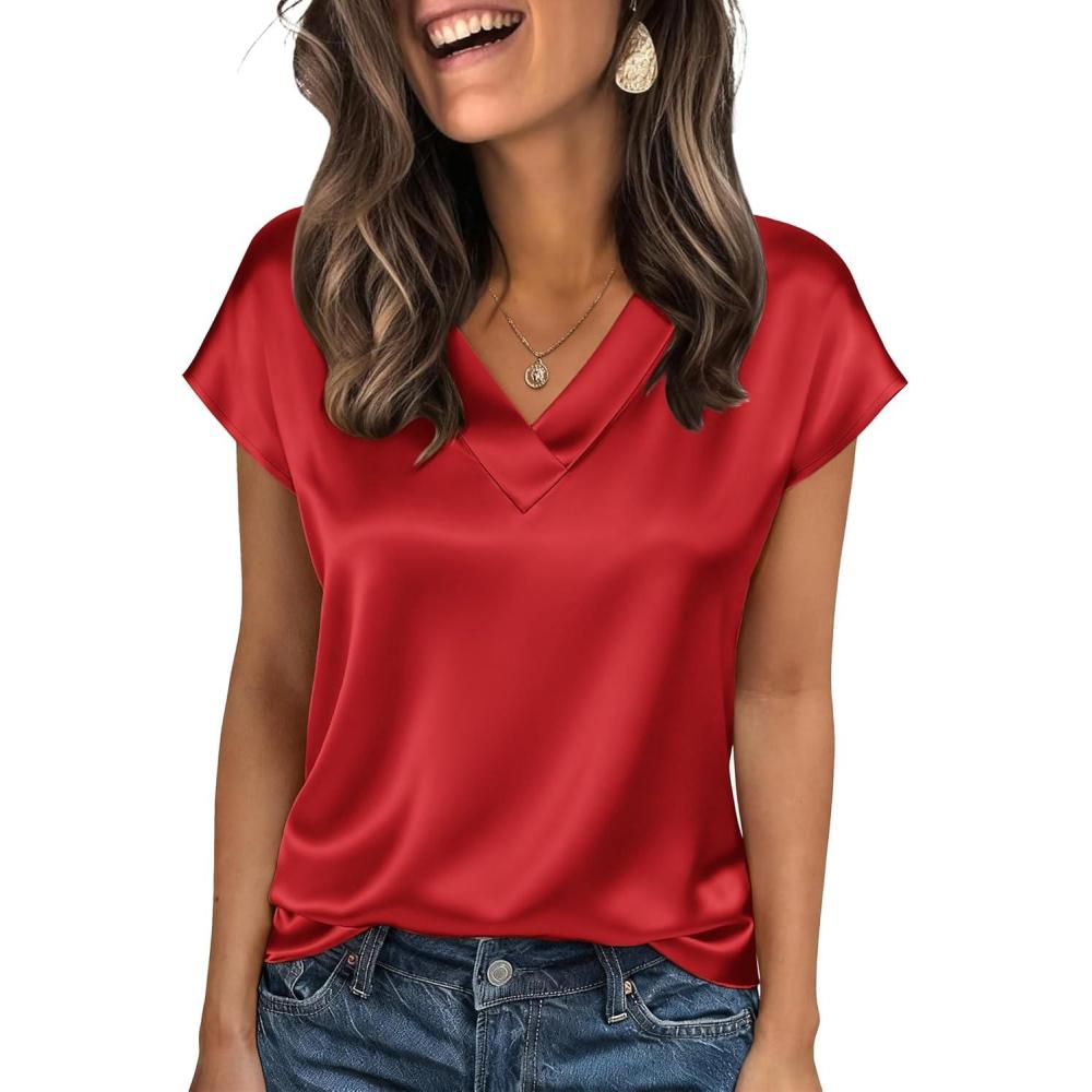 Zeagoo Women Silk Satin Tops Cap Short Sleeve Blouse V Neck Shirts Business Casual Outfits S-2XL(Red)