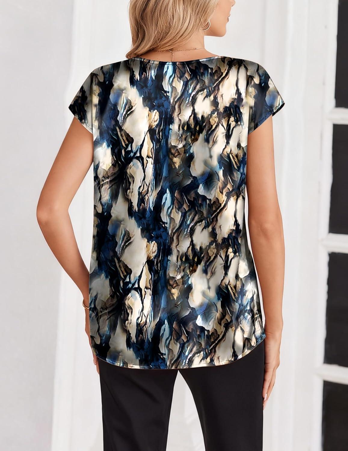 Zeagoo Women Silk Satin Tops Cap Short Sleeve Blouse V Neck Shirts Business Casual Outfits S-2XL(Zr220)