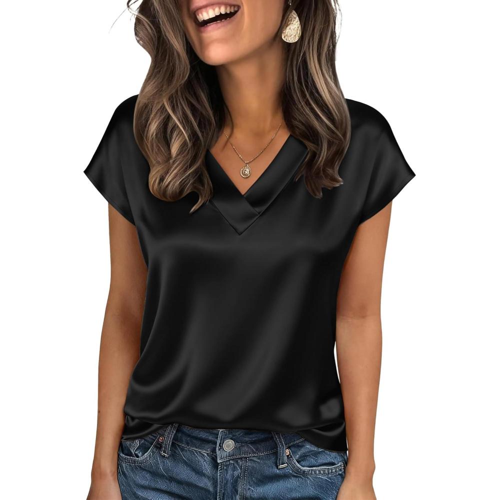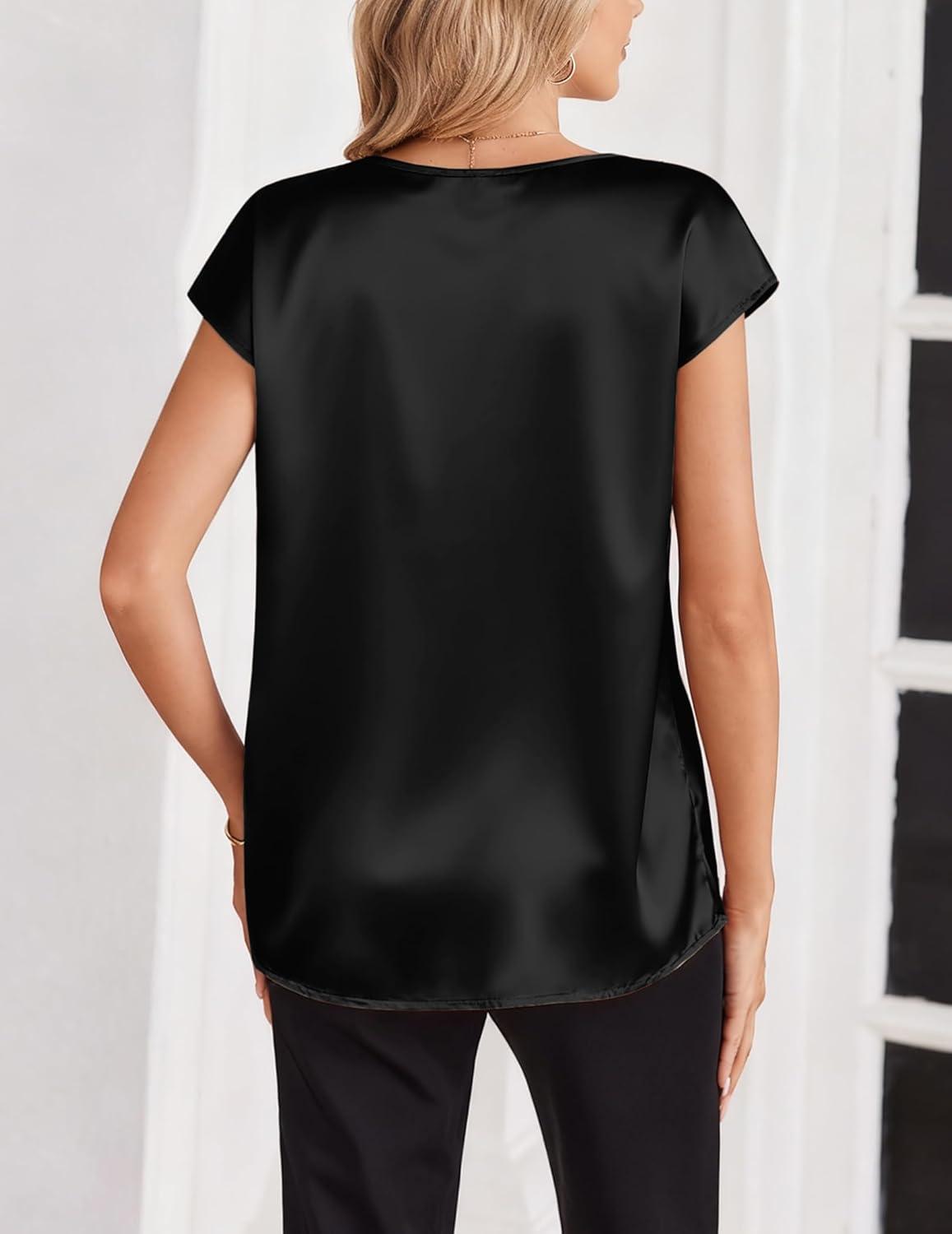 Zeagoo Women Silk Stain Tops Cap Short Sleeve Blouse V Neck Shirts Business Casual Outfits S-2XL(Black)