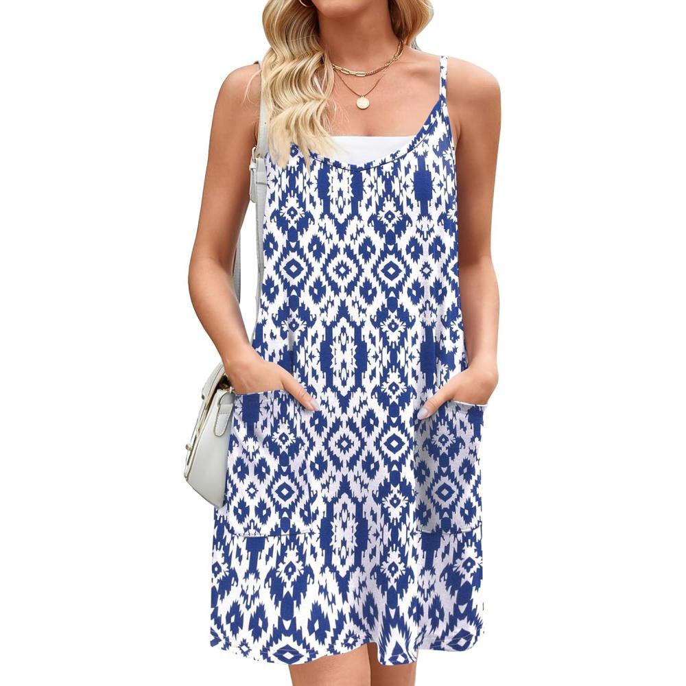 Zeagoo Women Summer Dresses Casual Beach Vacation Dress Spaghetti Strap Sundress Sleeveless Mini Short Dress with Pockets(Blue White Printed)