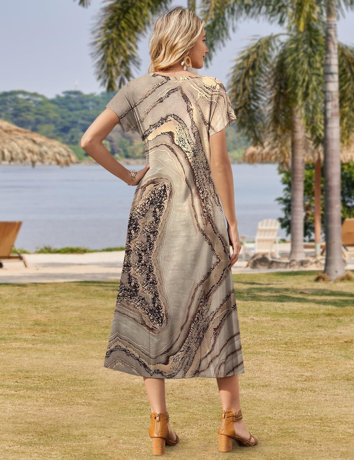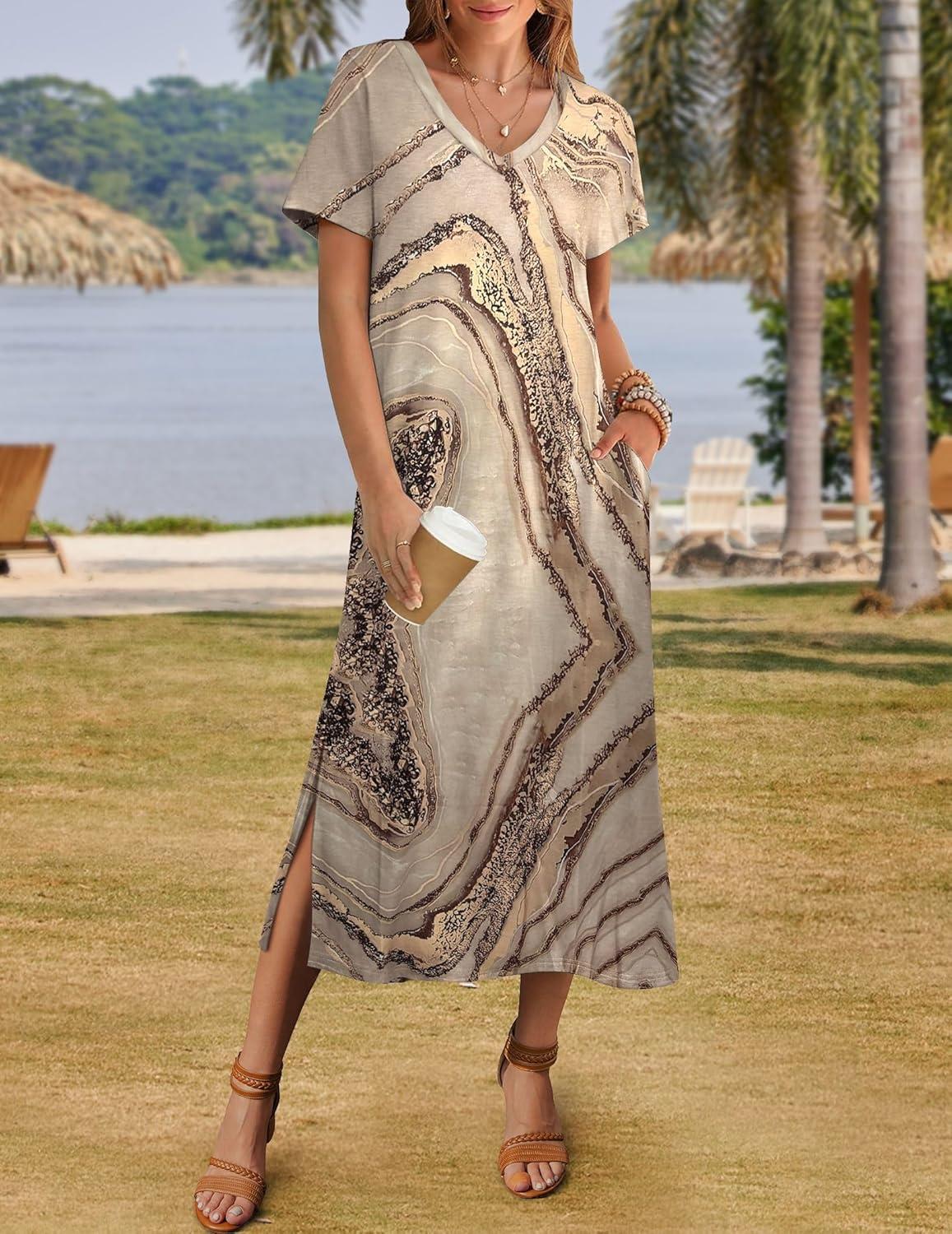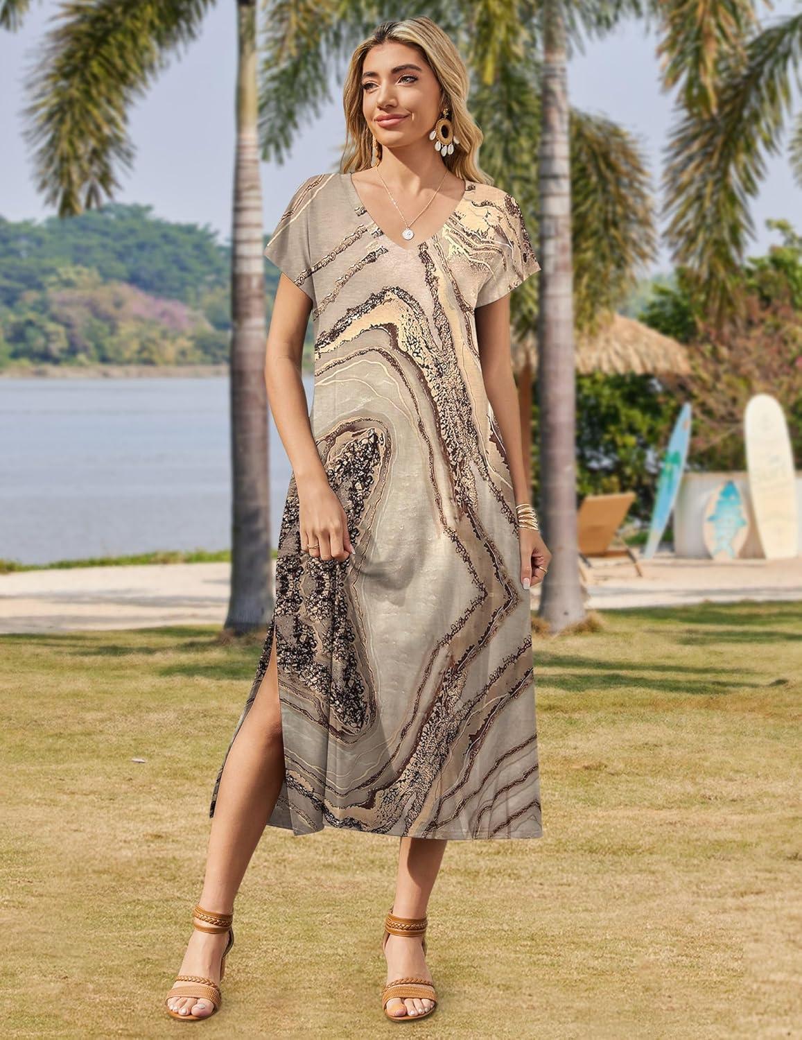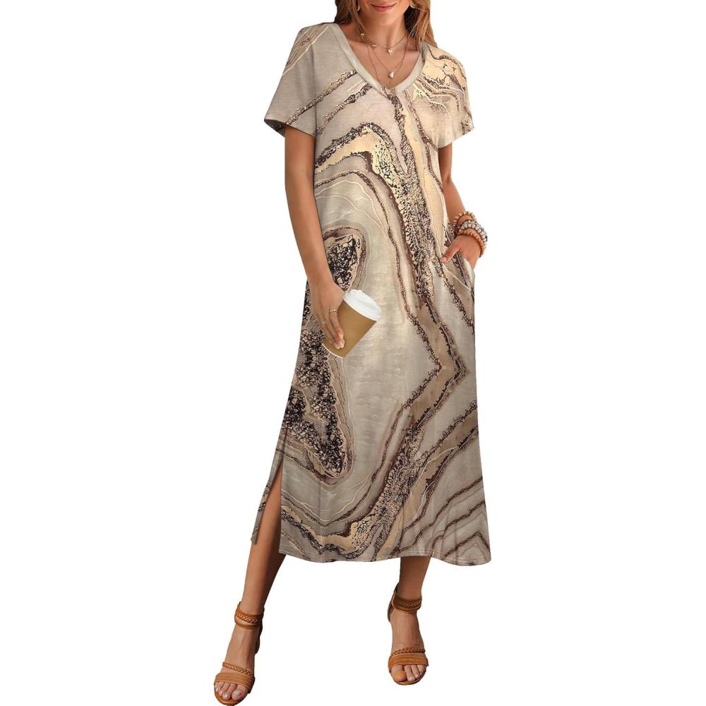 Zeagoo Women Summer Floral Dress Short Sleeve Beach Dress with Pockets Casual V-Neck Split Long T-Shirt Dress Travel Vacation(Gold Print)