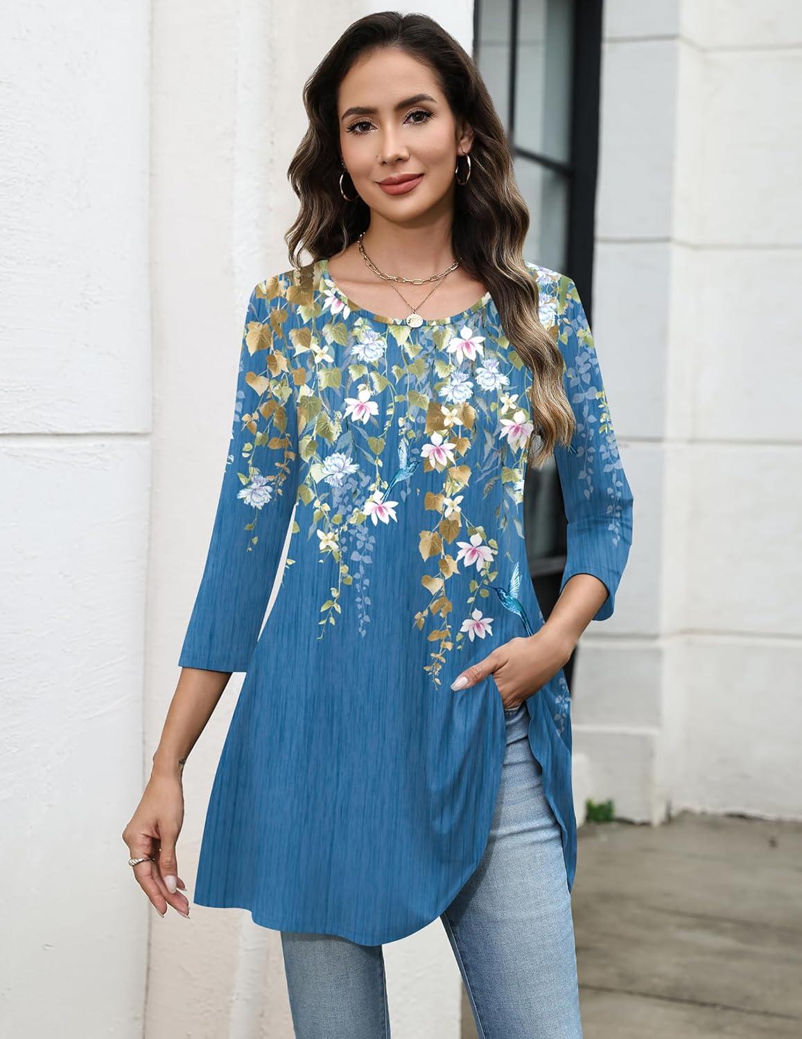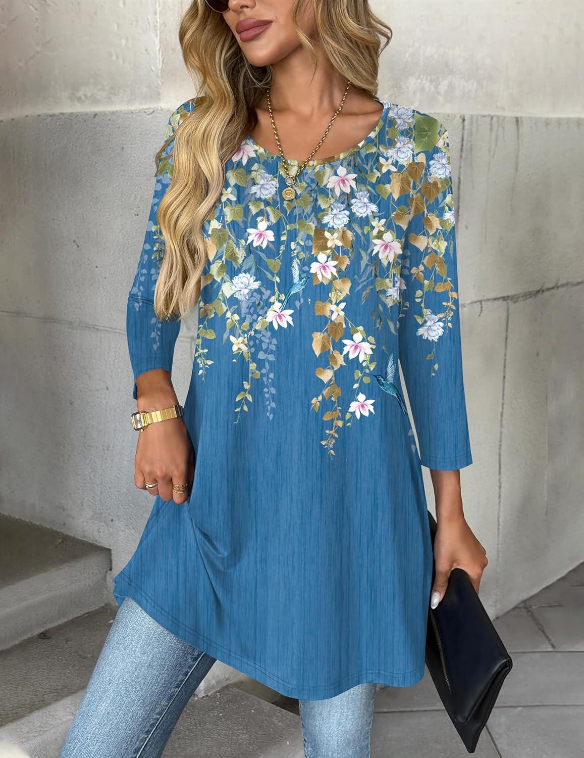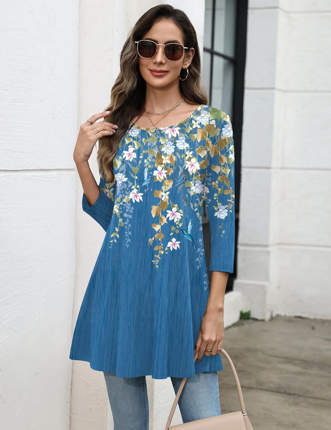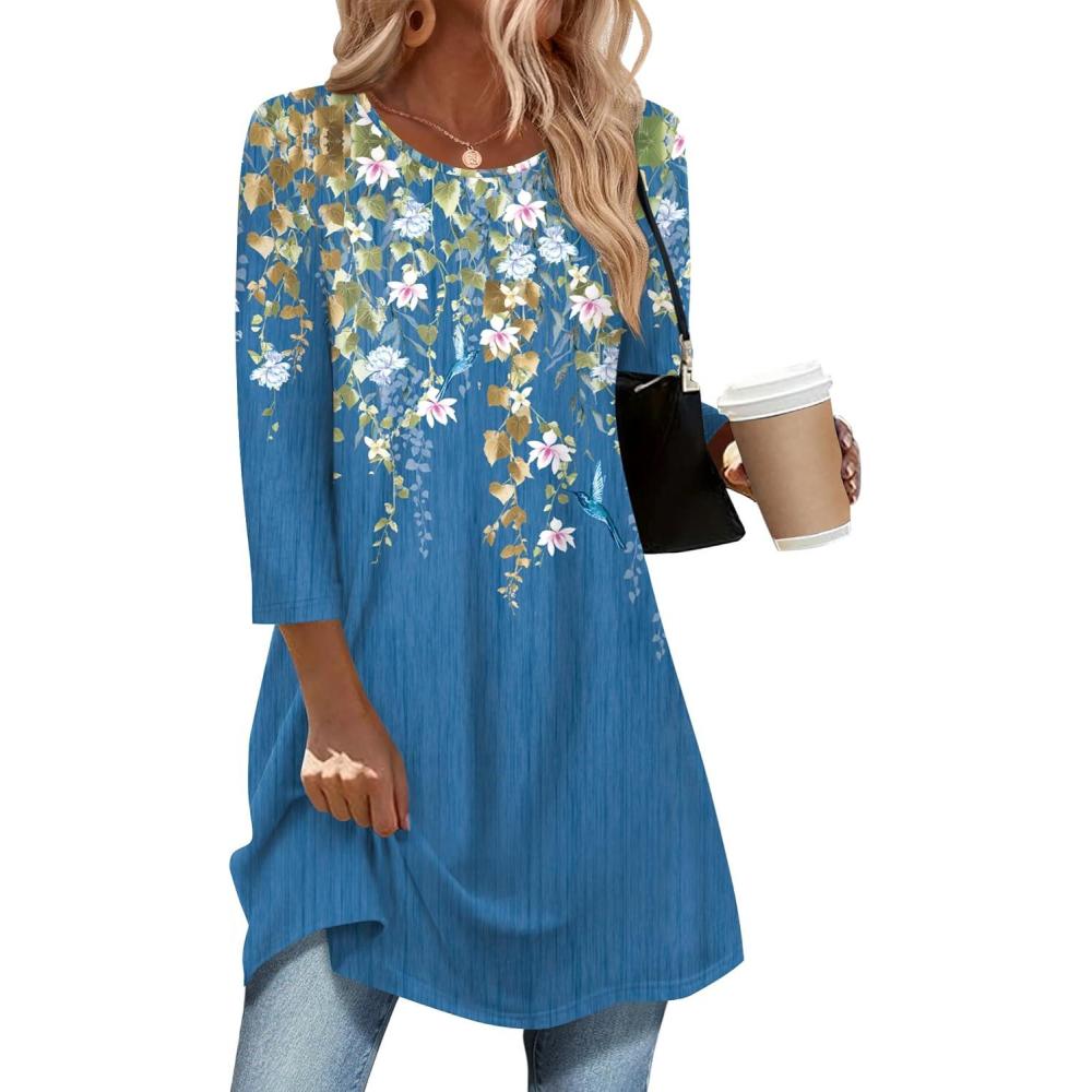 Zeagoo Women Tops 3/4 Sleeve Dressy Casual Plus Size Tunics to Wear with Leggings Swing Flare T-Shirt Loose Blouses S-3XL(Blue Flower-sf223)