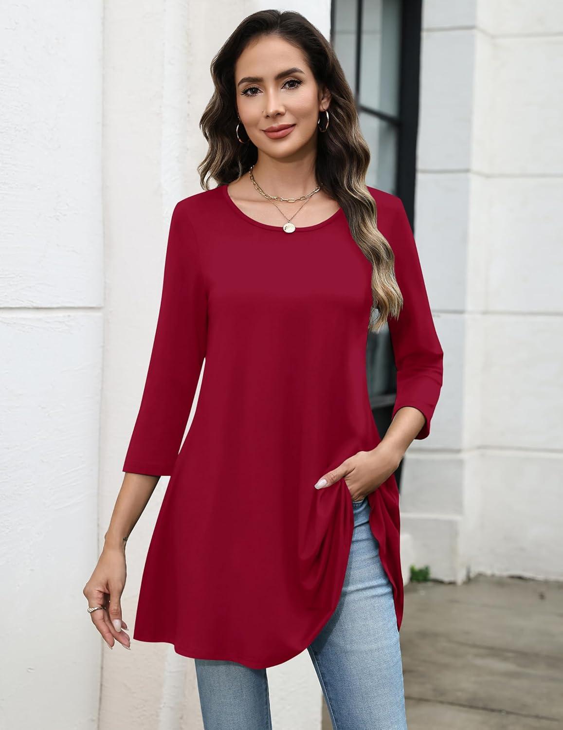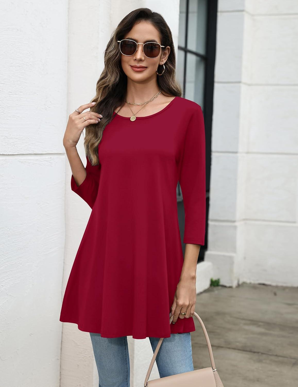 Zeagoo Women Tops 3/4 Sleeve Dressy Casual Plus Size Tunics to Wear with Leggings Swing Flare T-Shirt Loose Blouses S-3XL(Red)