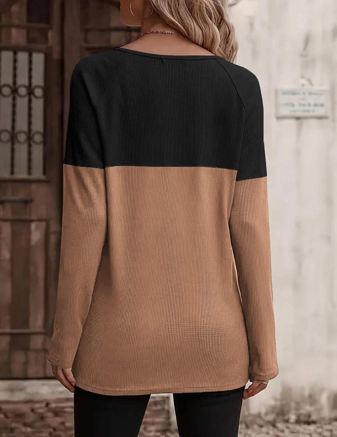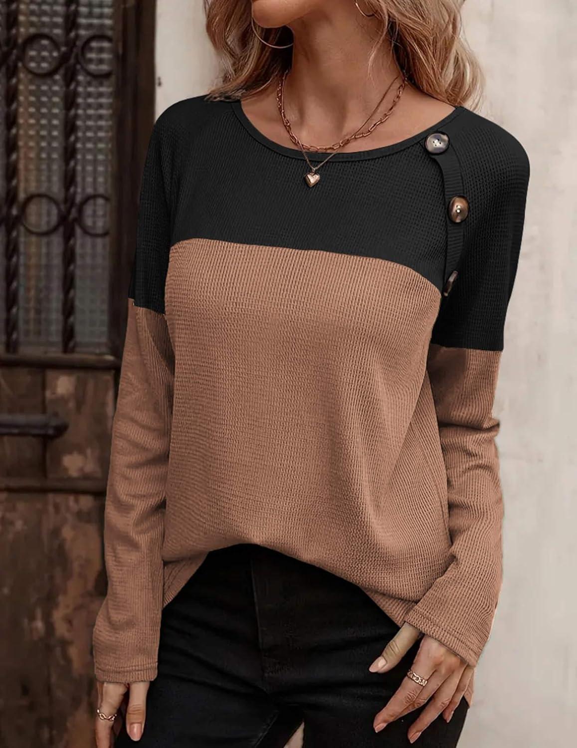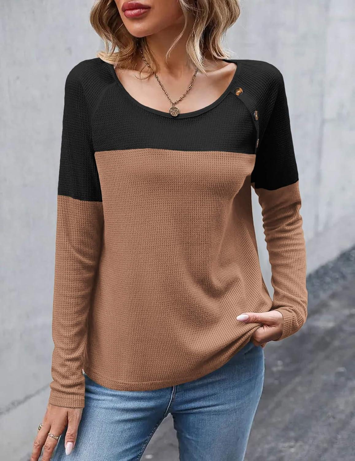 Zeagoo Women Waffle Knit Shirts Long Sleeve Colorblock Tee Button Detail Tunics(Black+brown)